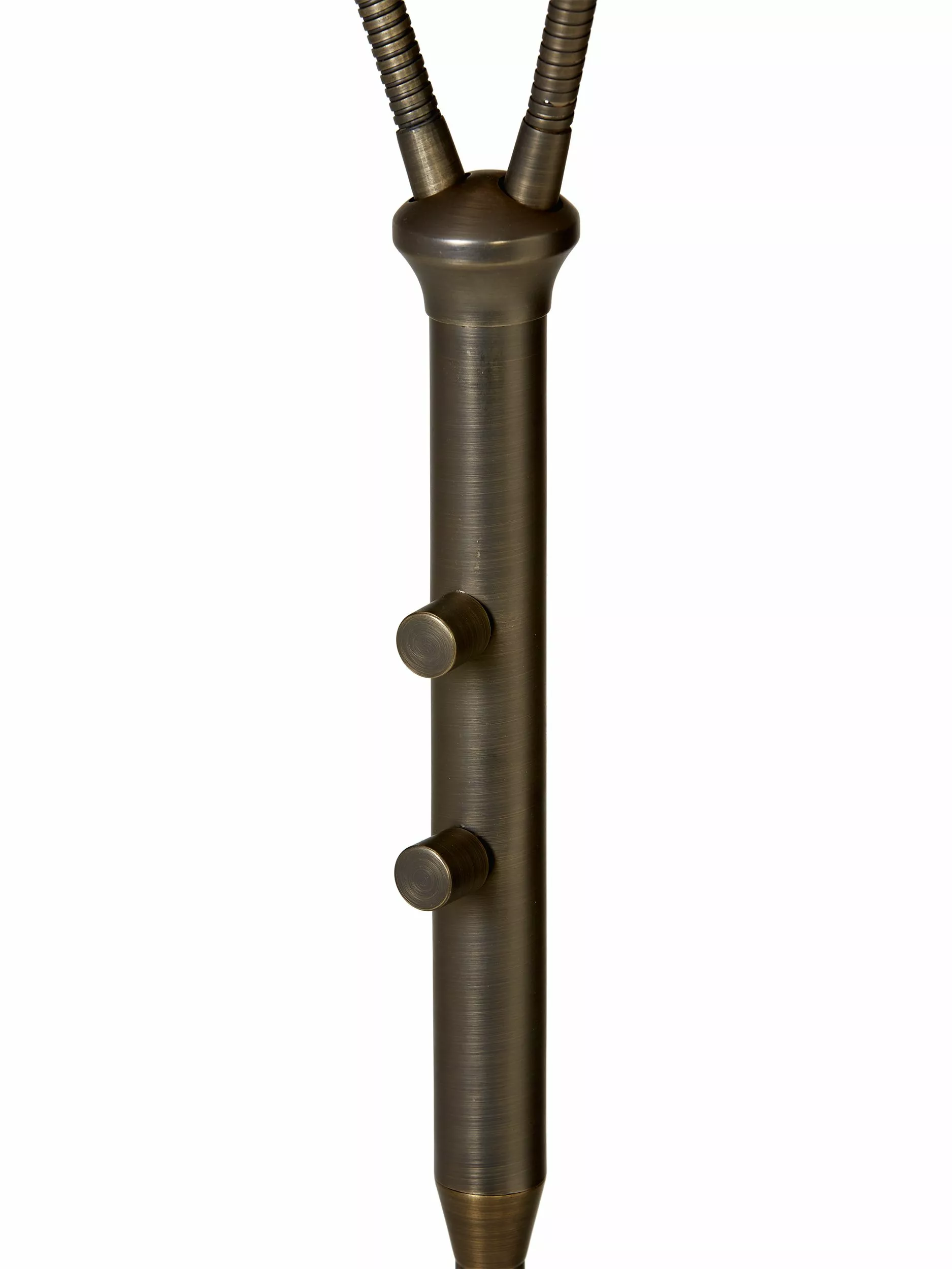 Koster golvlampa med två lamphuvuden passar bra mellan två fåtöljer för bra läs-ljus. Tack vare två separata dimrar på armaturen kan man ställa ljusstyrkan olika på de båda ljuskällorna.