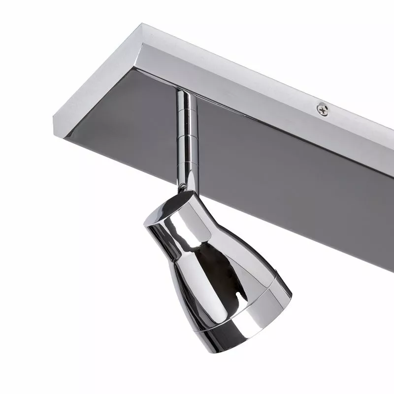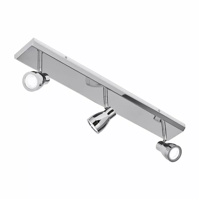 Kromad modern vägglampa med tre spotlights för riktbart ljus. Fungerar lika bra i ett tak. Välj med fördel dimbar LED för att kunna ställa ljusstyrkan efter behov.