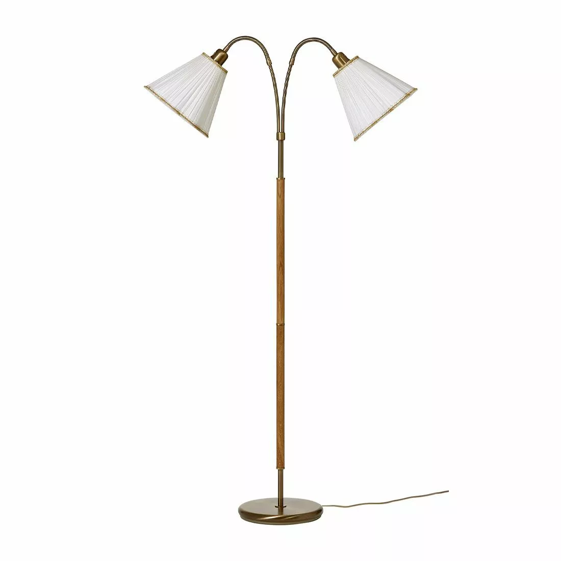 Klassisk golvfot med två armar med E27-sockel att kompletterna med valfri lampskärm samt ljuskälla utefter behov. Golvlampan är tillverkad i ek och oxiderad mässingsutförande som är en klassisk och vacker kombination.
