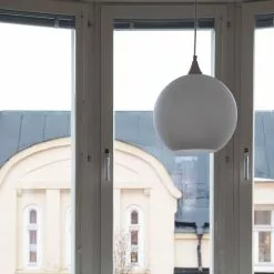 Bell är en stilren taklampa med fyra stycken glasskärmar i färgen amber monterade på en mässingsfärgad stomme i metall. Det amber-färgade glaset ger ett mjukt och behagligt ljus. Taklampan har krokupphäng och kompletteras med takkontakt och ljuskällor med E14 sockel.