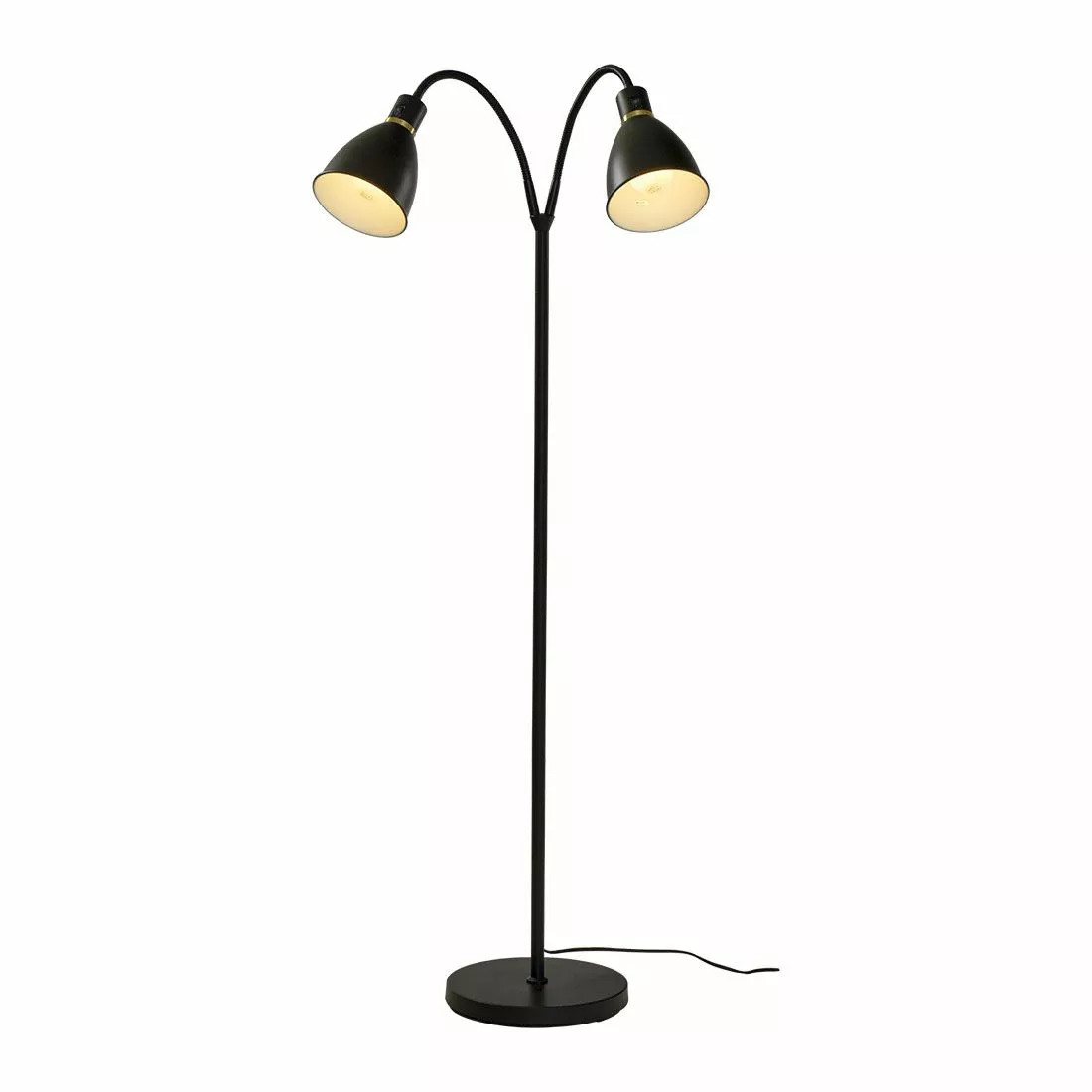Golvlampan Idre med dubbla lamphuvuden har en klassisk design i svartlackerad metall och dekorativa ringar i matt mässing. På varje lamphuvud sitter en strömbrytare så att du kan välja om du vill tända en eller båda lamporna. Tack vare böjbara armar kan du enkelt rikta ljuset dit du vill.
