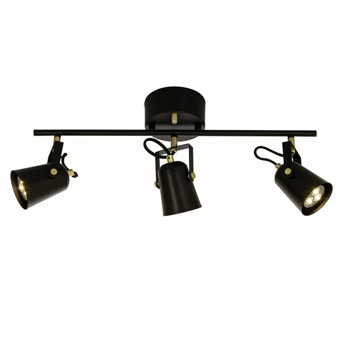 Snygg svart takspotlight med detaljer i mässingsfärgad metall som hängs med krokupphäng och kompletteras med takkontakt och 3st GU10-ljuskällor. Spottarna kan riktas i alla riktningar och ger en varierad och bra belysning i ett rum.