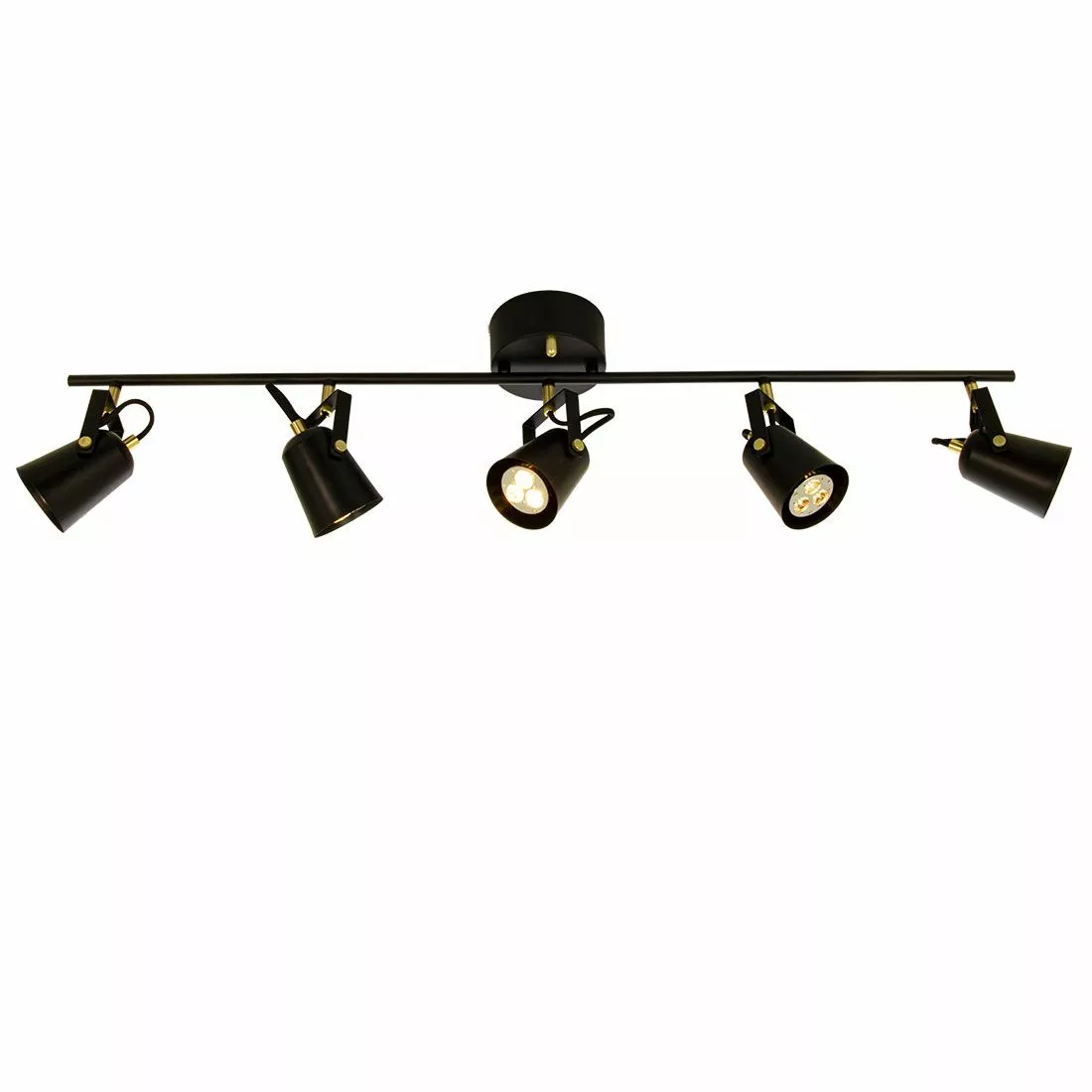 Snygg svart takspotlight med detaljer i mässingsfärgad metall som hängs med krokupphäng och kompletteras med takkontakt och 5st GU10-ljuskällor. Spottarna kan riktas i alla riktningar och ger en varierad och bra belysning i ett rum.