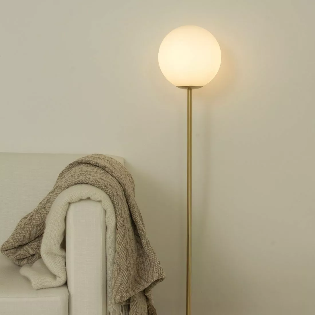 Molekyl är en stilren golvlampa med mässingsfärgad stomme och opalvit kupa i glas. Dess design gör sig bra i vardagsrummet där den sprider ett mjukt sken och ger ett trendigt inslag. Molekyl är en golvlampa med enkelt formspråk men som sticker ut från mängden. Kompletteras med en E14-ljuskälla med filament för bästa resultat.