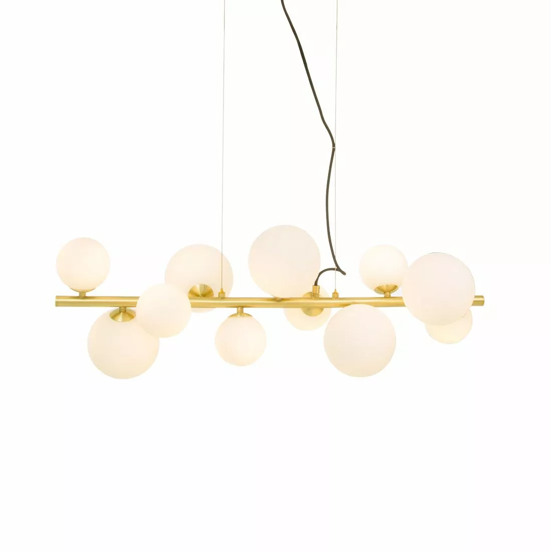 Mässingfärgad taklampa med vita kupor av glas över varje ljuskälla. Det vita glaset dämpar ljuset från ljuskällorna och ger ett vackert sken över ett matbord. Molekyl behöver 11st G9 ljuskällor och monteras på takkrok med krokupphäng som medföljer.