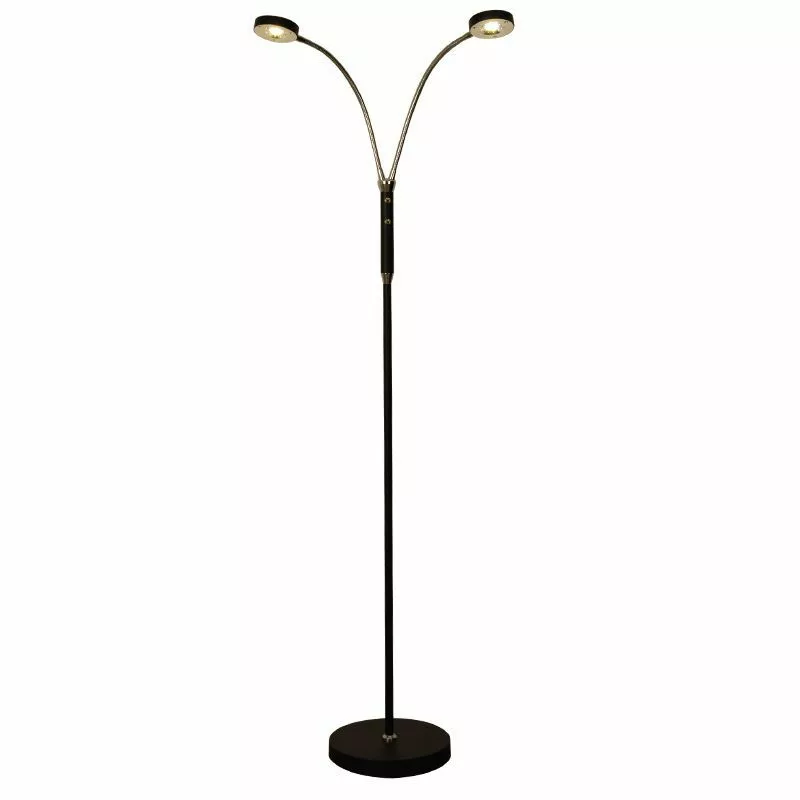Golvlampa som är utrustad med två st LED ljuskällor på ställbara armar. Strömbrytarna sitter på röret.
