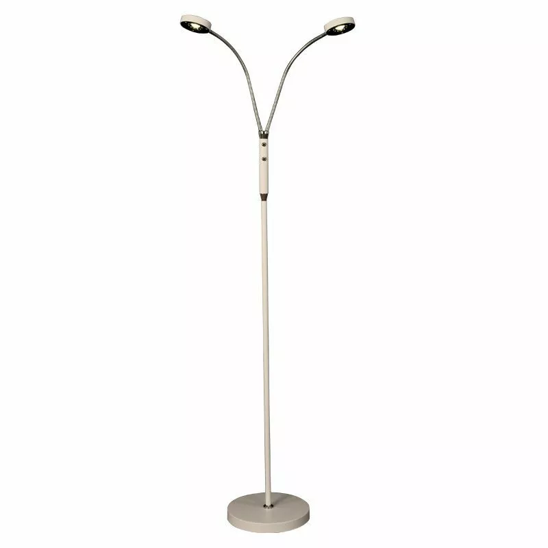 Golvlampa som är utrustad med två st LED ljuskällor på ställbara armar. Strömbrytarna sitter på röret.