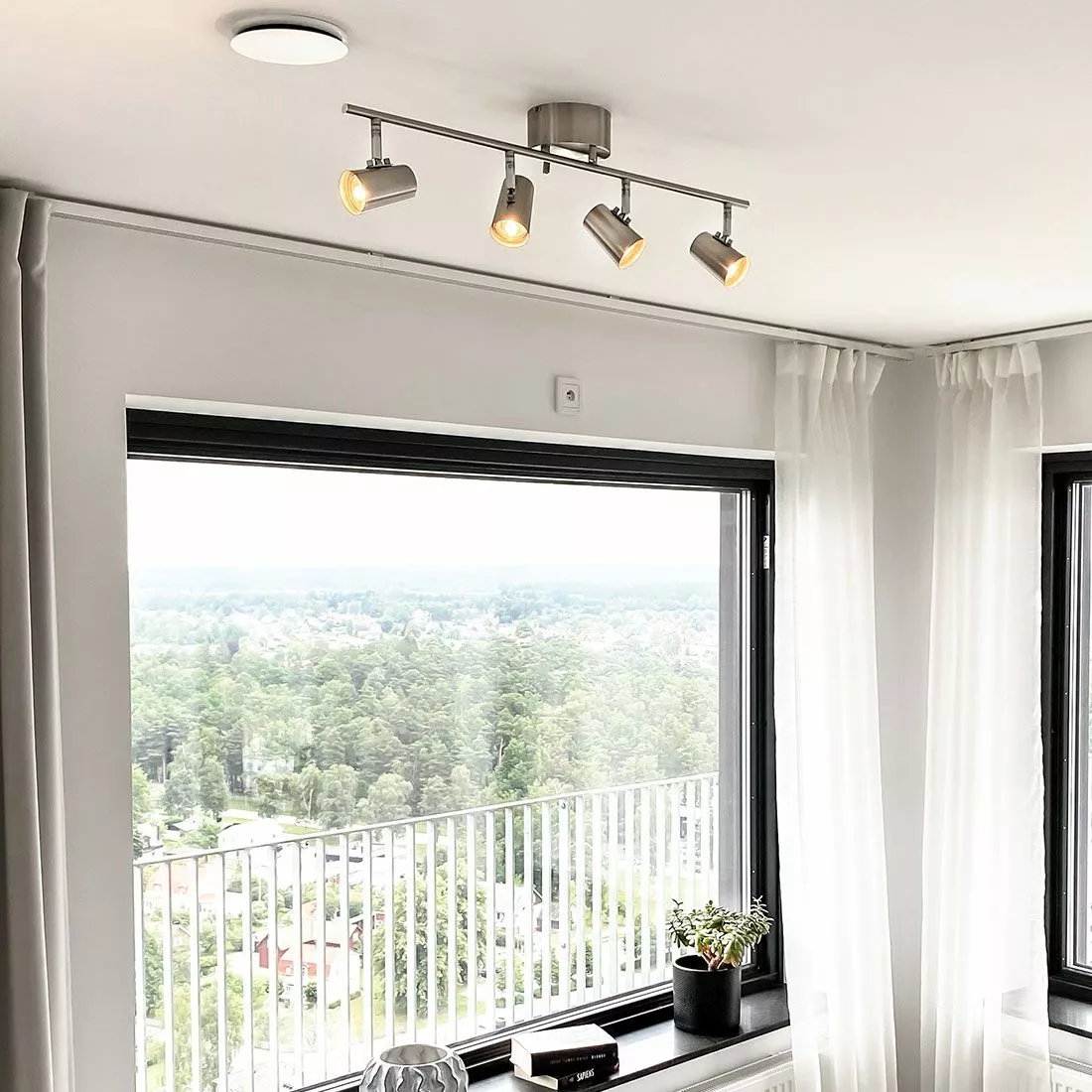 Pilot taklampa i stål med en rak arm bestående av 4 justerbara spotlights. Max 4 x 50W GU10, ljuskälla ingår inte. Krokupphäng med kopplingsplint, lamppropp monteras enkelt.