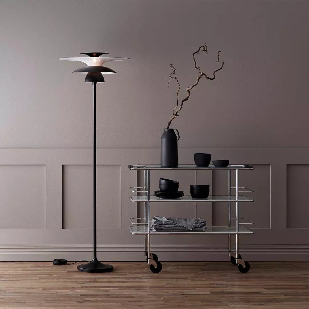 Mattsvart golvlampa med klassisk skandinavisk design. Detta är den större av de två modeller på golvlampan Picasso där skillnaden främst är storleken på skärmen. Tillverkad i Varberg på Belid’s egna fabrik. Serien Picasso kännetecknas av dess skärmar som skapar ett visuellt tilldragande uttryck. Golvlampan placeras vid soffans avslut eller i ett hörn av ditt vardagsrum. Skärmarna bländar av ljuset och ger en effektfull ljusbild.