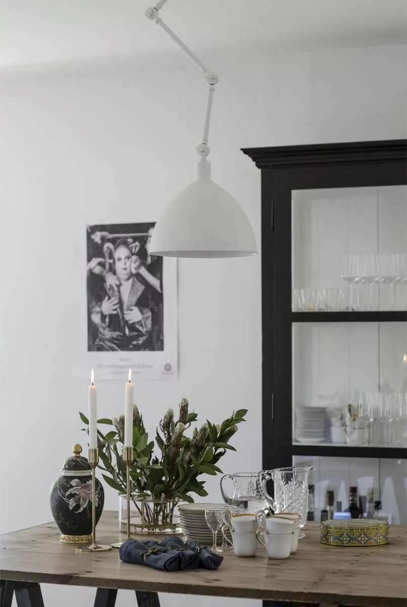 By Rydéns senaste tillskott till omåttligt populära serien Bazar är taklampan. Med krokupphäng är den lätt att montera och gör sig lika bra solitär som i ett par över köksön eller matbordet. Formen på Bazars kupa riktar ljuset nedåt och i sin helhet ger den en karaktär till vilket rum den än placeras i. Armen är ställbar och således även höjden.