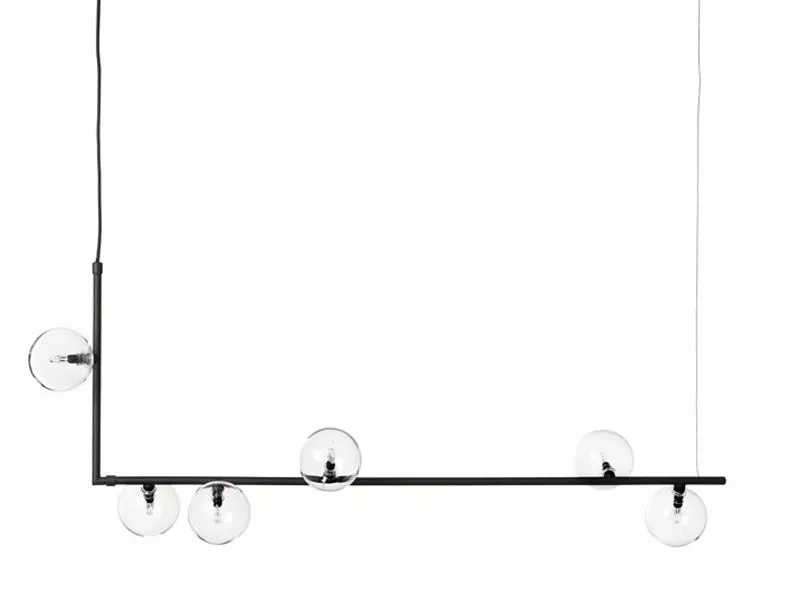 Air är en grafiskt utmanande taklampa med transparenta glasglober över varje ljuskälla som är asymmetriskt men noga utplacerade.
