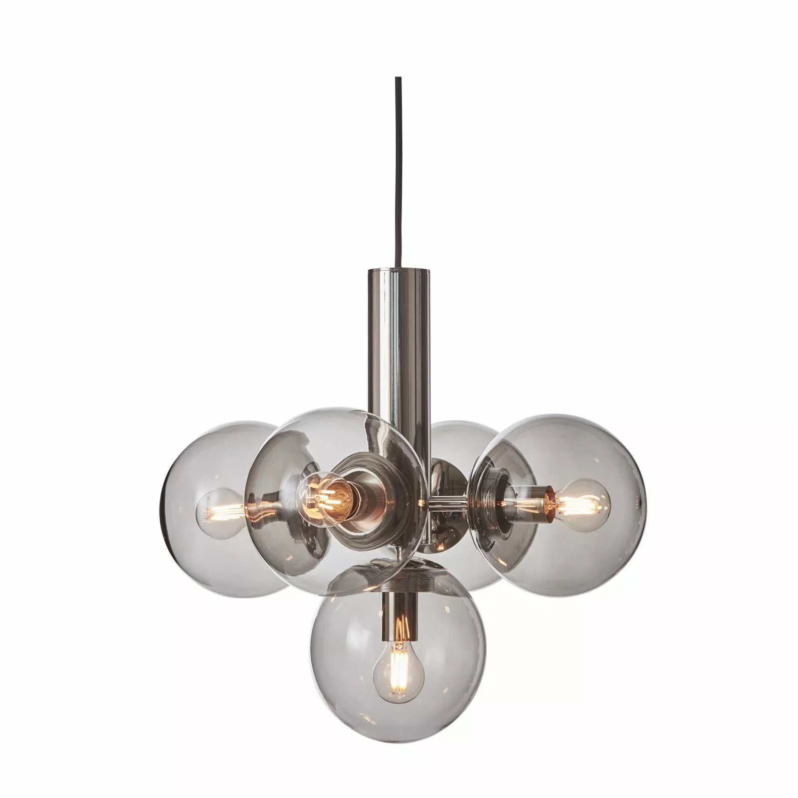 Avenue 43 är en stilren och snygg taklampa från Co Bankeryd där stommen i nickel håller fem stycken rökfärgade glasglober. Raka linjer tillsmmans med uppmjukande runda former gör Avenue 43 till en tidlös taklampa med starka samtida drag. Avenue 43 placeras över matbordet som i vardagsrummet över soffgruppen och är lika snygg solitär som tillsammans i par över det större matbordet. Glasgloberna skruvas på plats på lamphållaren som bestyckas med E14-ljuskällor utefter behov, tycke och smak. Se våra rekommenderade ljuskällor under ”Köp till”.