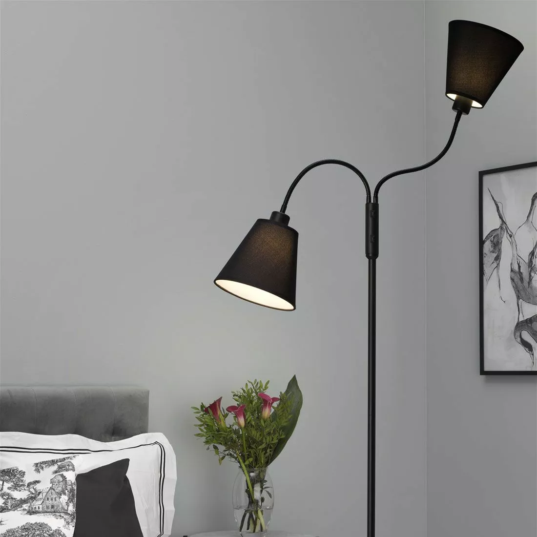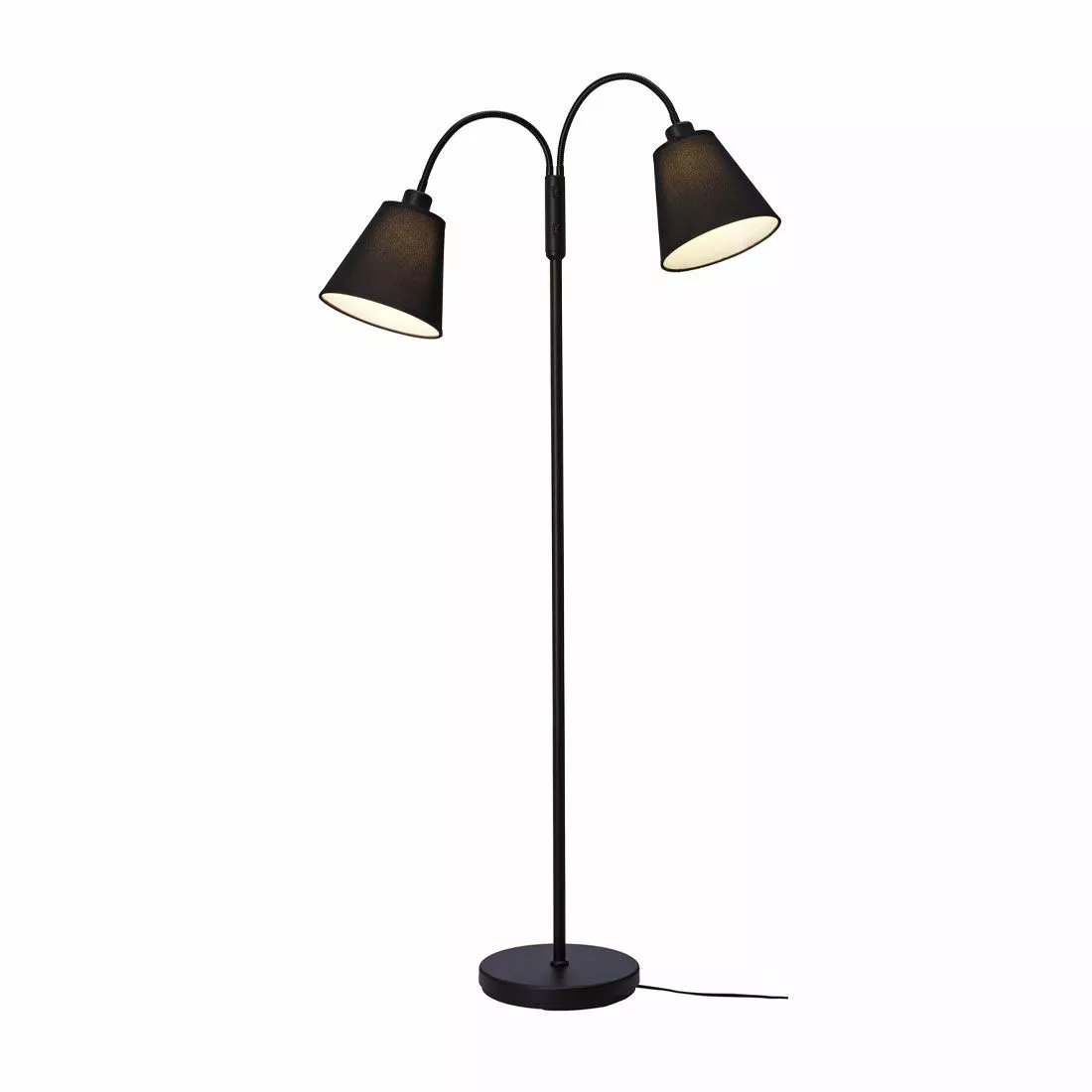 Duett är en tidlös golvlampa med trendig känsla i svart metall och två svarta konformade lampskärmar på flexarmar. Lampskärmarna har vit insida som reflekterar ljuset och sitter på armar som är justerbara för en smidig manövrering av ljusriktningen. Komplettera Solo med 2st ljuskällor med E27-sockel.