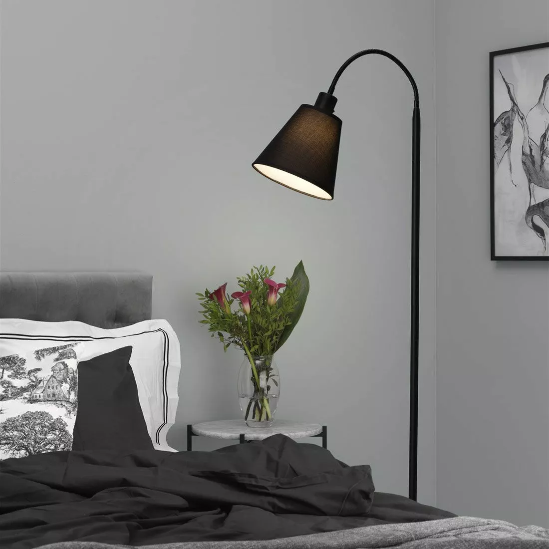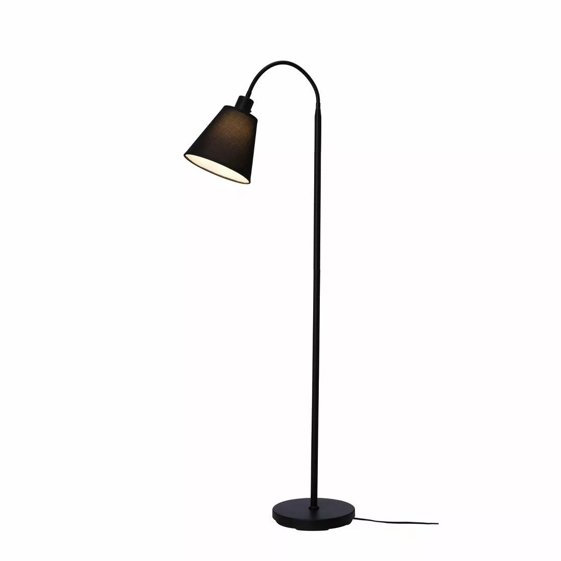 Solo är en tidlös golvlampa med trendig känsla i svart metall med svart konformad lampskärm på flexarm. Lampskärmen har vit insida som reflekterar ljuset och sitter på en arm som är justerbar för en smidig manövrering av ljusriktningen. Komplettera Solo med en ljuskälla med E27-sockel.