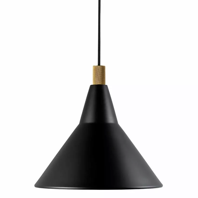 Serien Brassy från danska DFTP är en stilren taklampa i svart metall med retrodetalj i mässing. Lampans konform har brutits i två vinklar som förstärker detaljen i mässing.