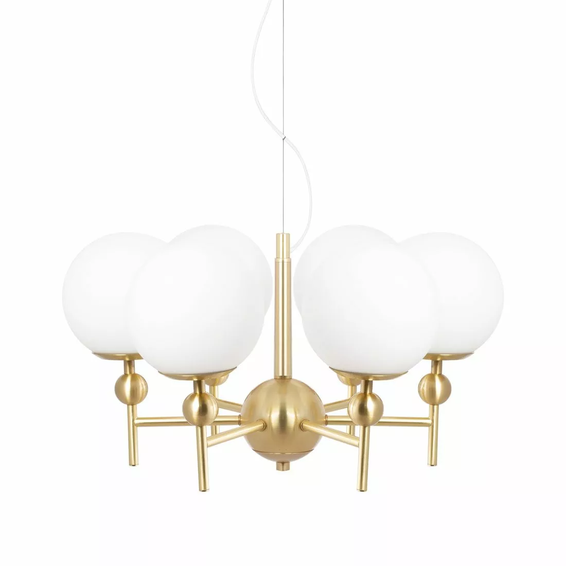 Vackra Astrid i all sin ståtliga enkelhet. En skönhet med tydlig flirt med 30-talets nätta formgivning. Opalvita glasglober i kombination med mässing. Astrid kan med sitt stilrena klassiska formspråk hänga i de allra flesta rum, som den pampiga hallen med högt i tak, över matsalsbordet eller i vardagsrummet.