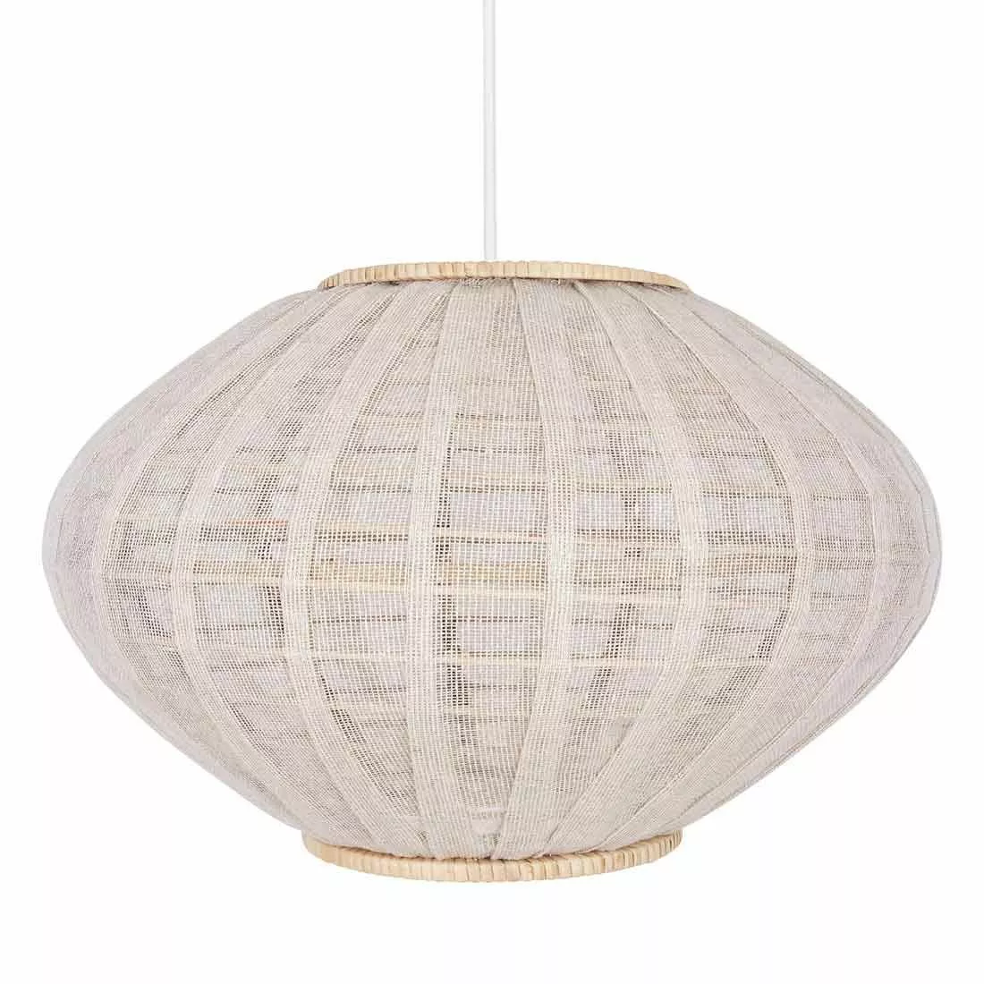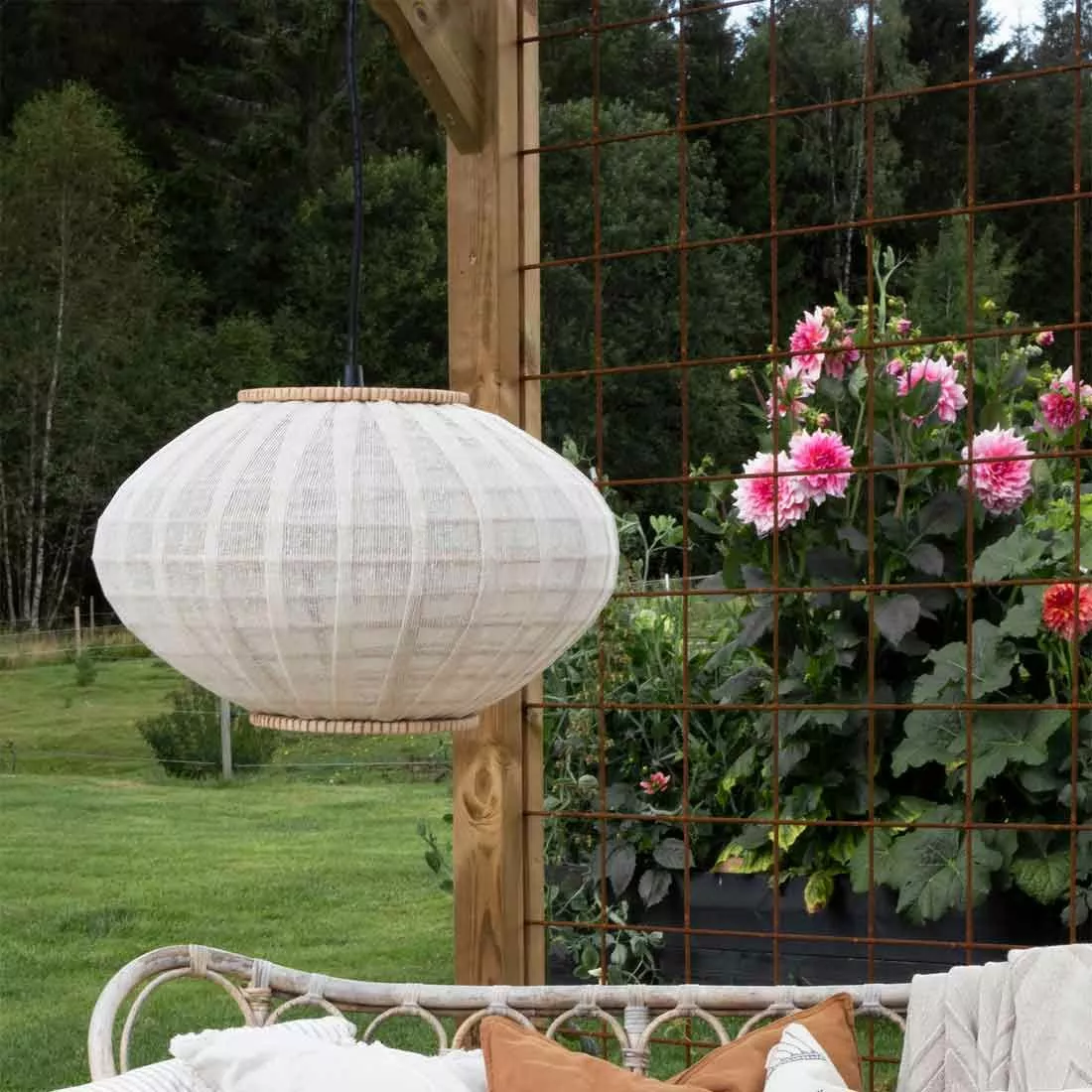 Lampan Borneo är tillverkad av naturfärgad rotting och offwhite linnetyg. Lampan kan också hänga utomhus där väder och vind naturligt kan förändra utseendet på skärmens naturmaterial, komplettera då takskärmen med ett utomhusupphäng. Lampan har ringfäste avsedd för upphäng med E27-sockel.