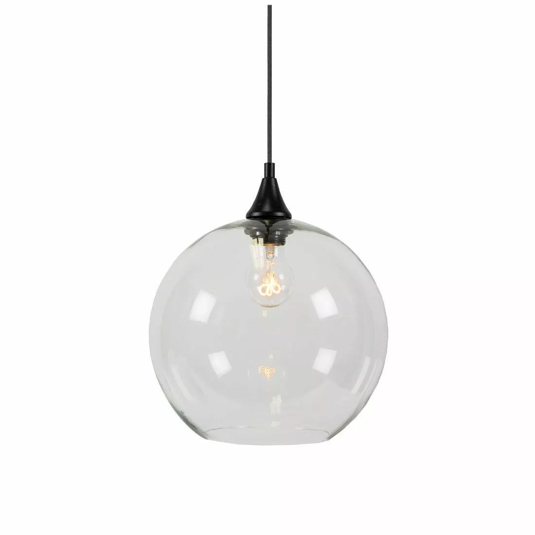 Pendel i klart glas med detaljer i mattsvart metall. 120 cm svart textilkabel med takkopp. Höjd 32 cm Diameter 28 cm . Lamphållare E27 Max 60W.