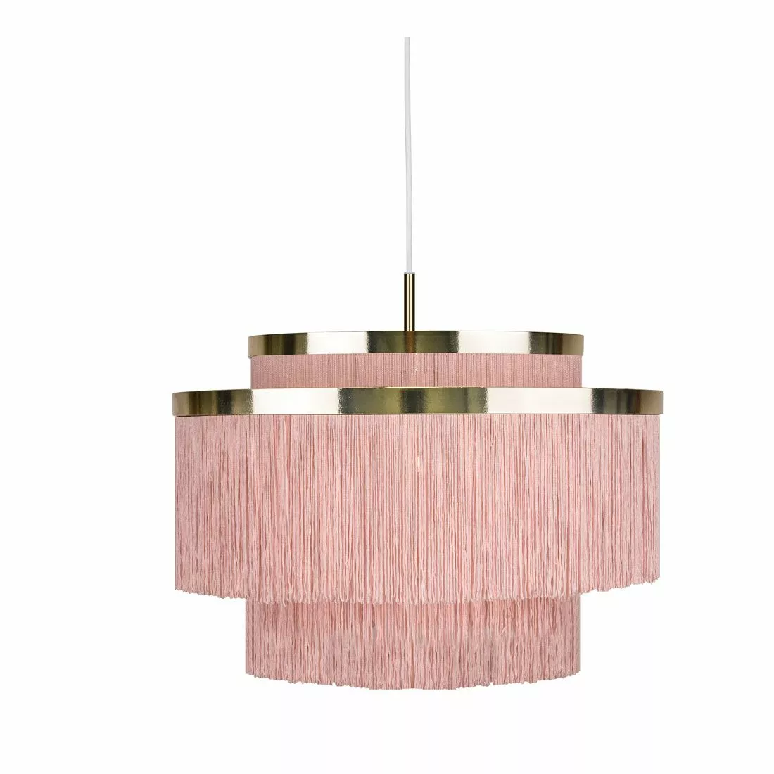 Fransar syns i både konfektion och möbler. ”Frans” är en serie som utstrålar exklusivitet. Den Rosa textilen kontrasterar mot Mässingen/Metallen och den 120 cm Vita textilkabeln blir pricken över i:et. Paketeras platt dessutom. Höjd 39 cm Diameter 52 cm . Lamphållare E27 Max 60W. Design: Patrick Hall