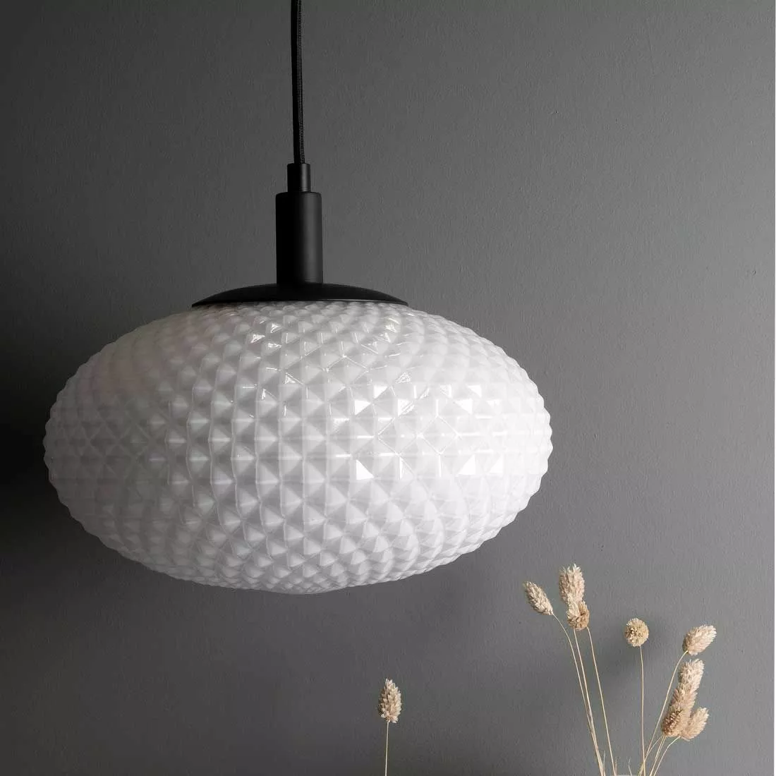 Stämningsfulla taklampan Jackson för tankarna tillbaka till 70-talet med sin tidstypiska pressade glaskupa i vitt glas. Upphänget är gjort i svartlackad metall. Jackson har en 120 cm lång svart textilkabel samt rund takkopp i svartlackad metall. Djup: 28 Bredd: 28Höjd: 22 (cm) Lamphållare: 1xE27 Max 60W