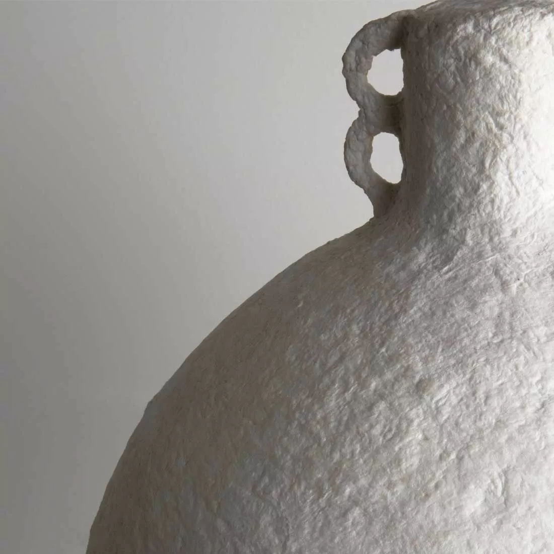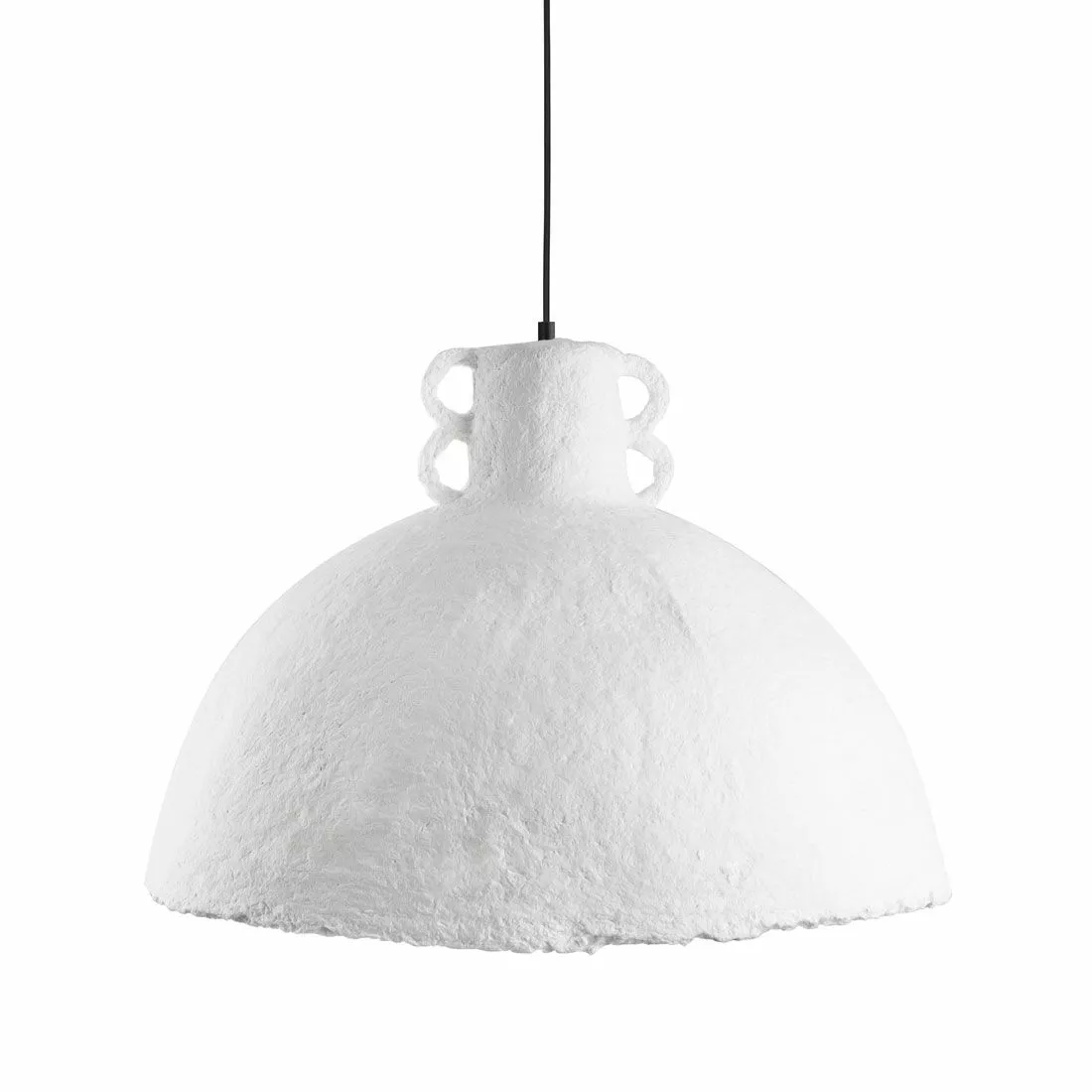Taklampan Maché är tillverkad i en vitpapier-maché, en teknik som innebär att den gjuts av papper tillsammans med lim. Kännetecknat för papier-machér är att form och struktur är unikt för varje lampa och kan skilja sig både från bild och mellan olika exemplar. Detta är en del av charmen i dess jordnära uttryck. Taklampans formspråk är besläktat med toppen av en stor urna i keramik och har symboliska handtag vid lampsockeln som ger Maché dess karaktäristiska uttryck. Komplettera Maché med takkomtakt och ljuskälla utefter behov.