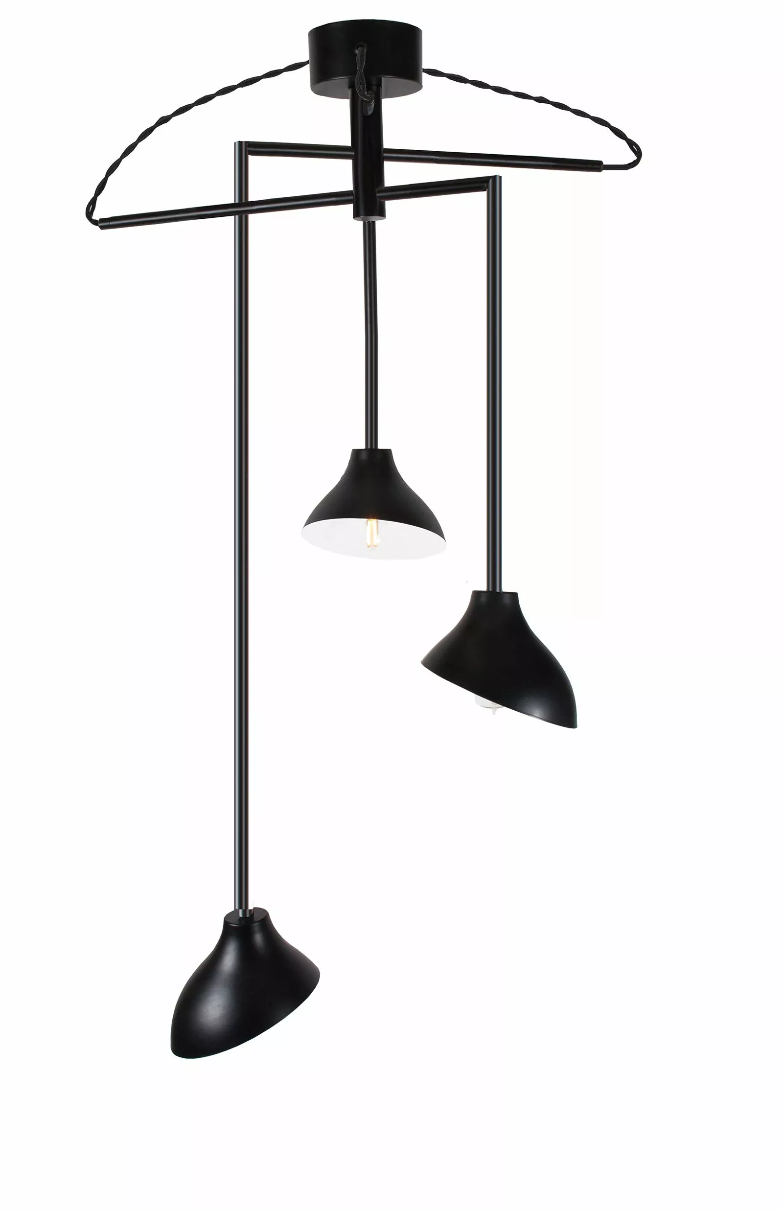 Taklampan Shift i svart metall med tre hängande skärmar i olika höjd ger ett modernt och industriellt uttryck. Placera Shift taklampa i en trapp för ett karaktäristiskt blickfång, eller över matbordet där Shift får synas från alla håll. Shift har en tvistad tygkabel i enlighet med sin design och armarna går att ställa i sidled, på så vis kan du också påverka lampans storlek och intryck. Shift gör sig lika snygg som taklampa i köket som i vardagsrummet där du vill ha både lampa och möbel i ett.