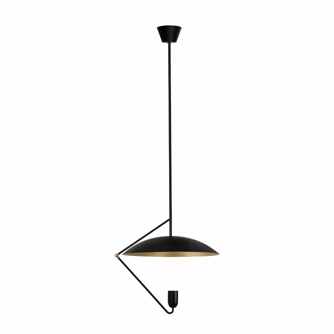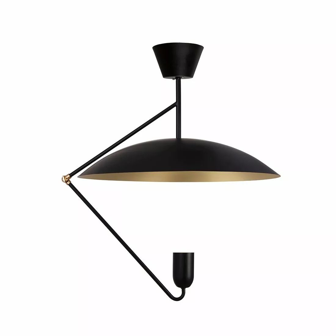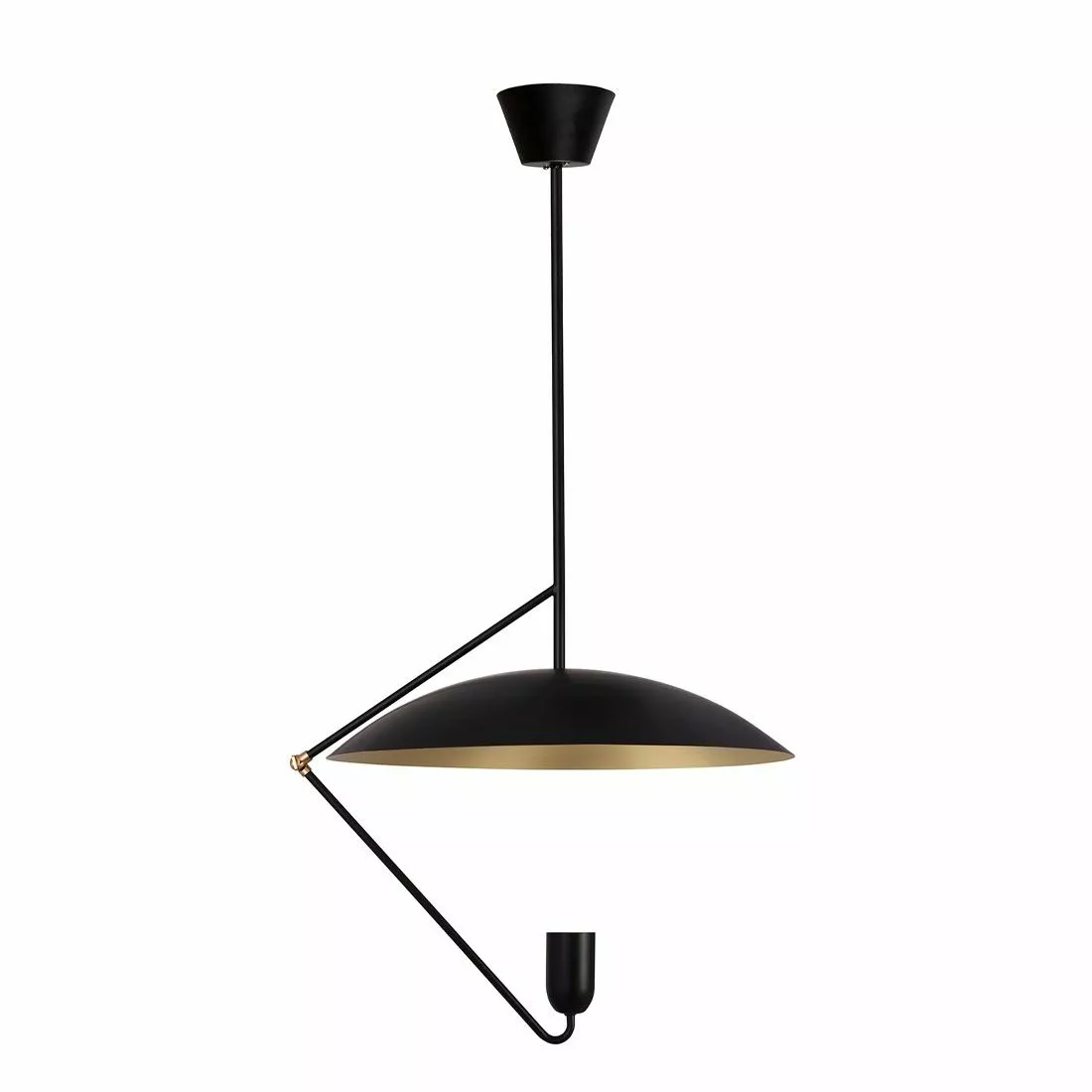 Denna taklampa med inspiration från sekelskiftet leker med ljuset på ett spännande sätt. Lamphållaren är försänkt i kupan för att dölja ljuskällan och skapa ett spännande riktat ljus och den rundade skärmen har en undersida i borstad mässing för att vackert reflektera ljuset. Undercover är gjord i svartlackad metall med detaljer i borstad mässingsfärgad metall. Lampan hänger på fast delbar metallpinne från taket. Pinnen är delad på två, 40 cm respektive 60 cm, vilket gör att lampan kan hängas med tre olika höjdalternativ. Minsta höjd 65 cm, mellan 105 cm och högsta höjd 165 cm Bredd: 50 Djup: 50 Höjd: högsta möjliga 165 (cm) Lamphållare: 1xGU10 Max 35W