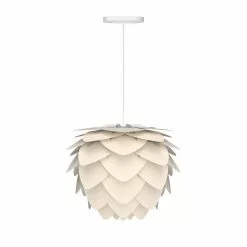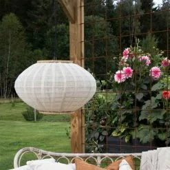 Klassiskt veckad naturfärgad lampskärm i vid modell med E27 toppringfäste för montering på takupphäng.