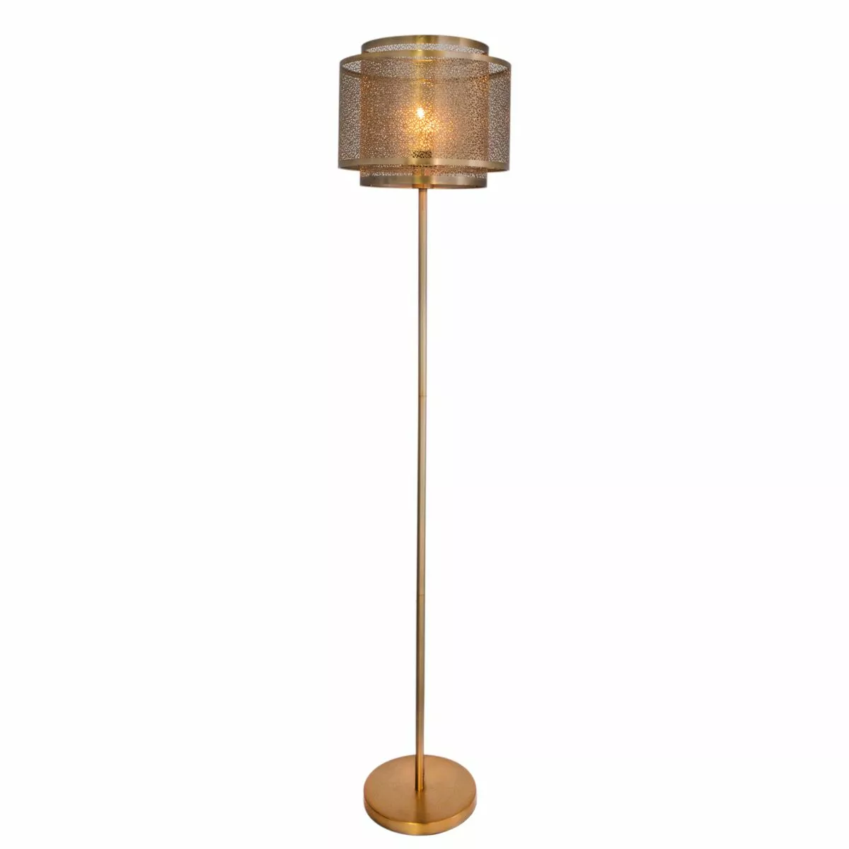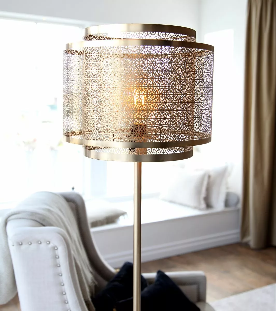 Golvlampan Hermine från By Rydéns ger en inbjudande känsla i ditt hem. Hermine är i metall med en matt mässingfinish och släpper ut ett magiskt behagligt ljus. Placera denna vackra golvlampa med sin hålmönstrade cylinder skärm som är för tankarna till blommor i ditt vardagsrum, hall eller varför inte i sovrummet.