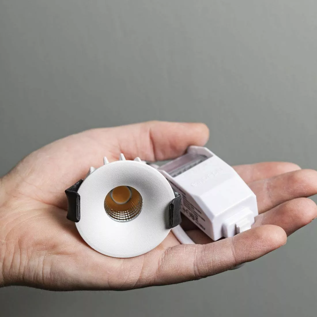 Exklusiv accentarmatur i litet format med väl utvecklad reflektorteknik. Insänkt ljuskälla som ger ett diskret och väl avbländat ljus med mycket god färgåtergivning, RA>95. Liten och lågbyggande – perfekt för glespanel 28mm med 13mm gips. Vacker som dekorbelysning ensam eller i grupp. Svart frontring finns som tillbehör. Komplett med litet fasdimringsbart drivdon, snabbplintar för vidarekoppling samt skruvfri dragavlastning för enkel installation. Dimbar med de vanligaste dimrarna på marknaden.