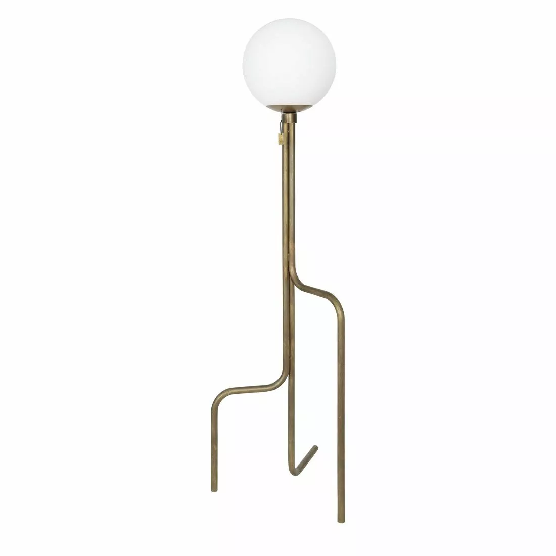 Strapatz golvlampa är en skulpturell pjäs som tar för sig i ett rum. En industriell golvlampa med gedigna ben i äkta råmässing och kupa i matt opalfärgat glas.