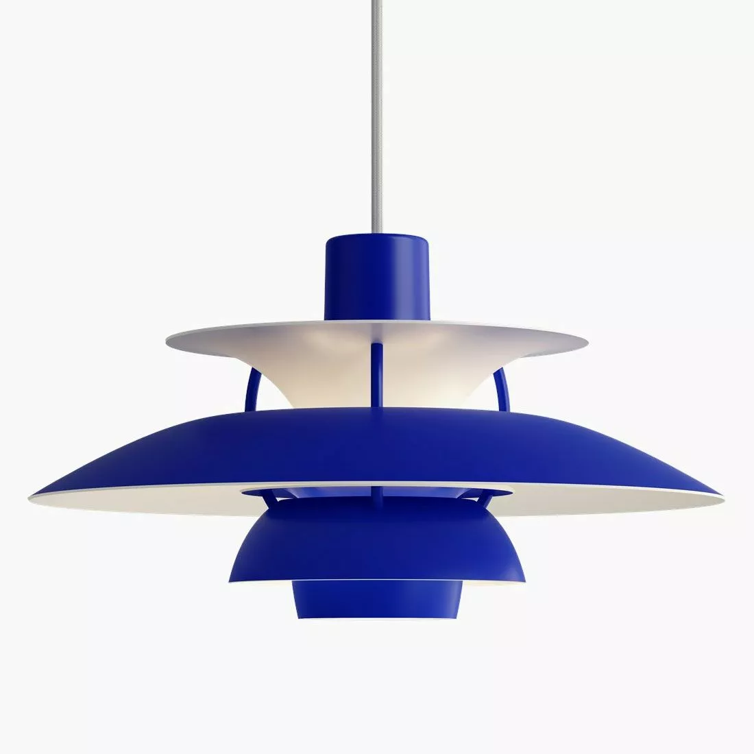 PH 5 Mini Takpendel Monochrome från Louis Poulsen är tillverkad i aluminium, med en mattlackerad blå ytfinish. Genom att både skärmarnas ovansida och stagen är helt enfärgade uppnår man den ”monokroma” känslan. Lampan avger precis som sina många syskon ett bländfritt och behagligt ljus. Detta gör att den passar utmärkt både över ett soffbord eller ett matbord.