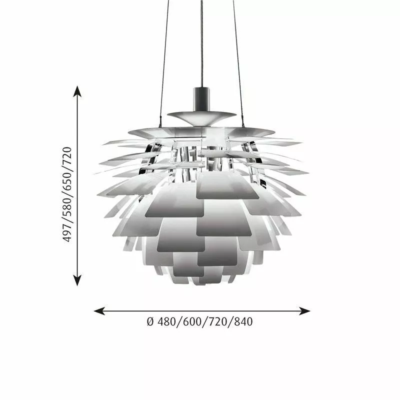 Designen av PH Kotten (PH Artichoke) gör att ljuset är bländfritt oavsett vilken vinkel du befinner dig runt lampan. De 72 bladen runt lampan är noggrant vinklade och fördelade på 12 rader med sex blad i varje rad. Ljuset från ljuskällan belyser själva armaturen och ger en rundsymetrisk ljusspridningen. Lampan ger ett behagligt och dekorativt ljus i ditt rum. Ledningslängden på lampan är 4 meter och lampan väger 22,5kg.