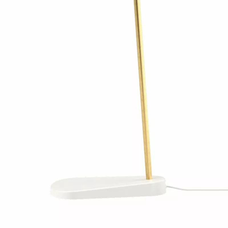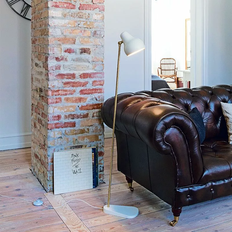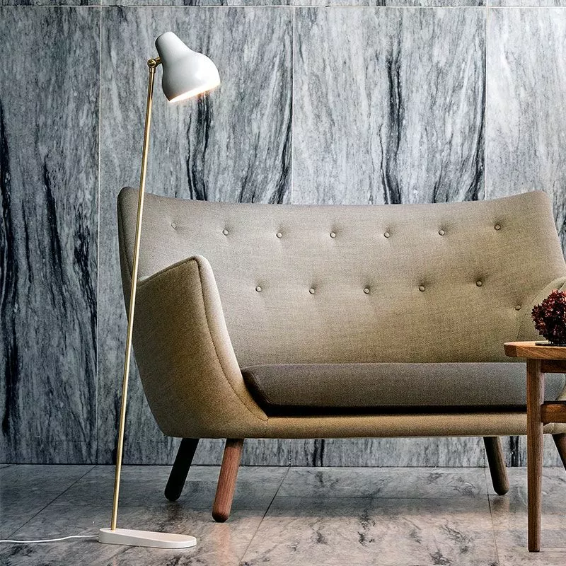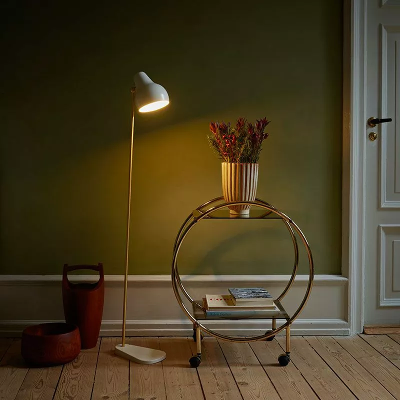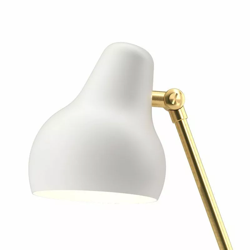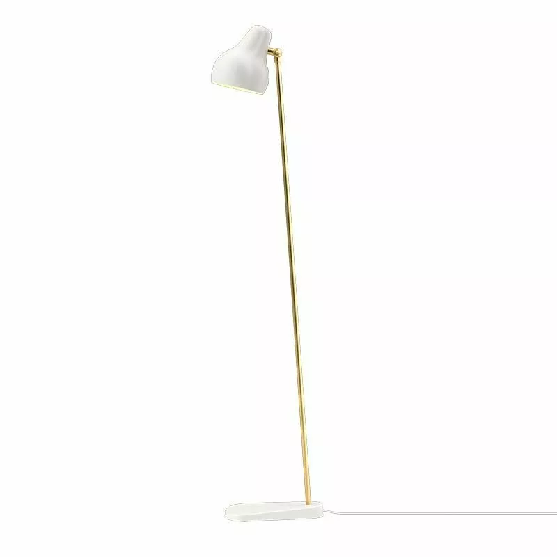 Golvlampan VL38 i vitlackerat aluminium och mässing från danska Louis Poulsen. VL38 Golvlampa har en integrerad led-ljuskälla med två ljusnivåer inbyggt för att ge möjligheten till 100% eller 50% ljusstyrka. Golvlampan har ett riktat ljus med 2700 Kelvin och 40Lm per Watt samt timerfunktion för automatisk avstängning av ljuset efter 4 eller 8 timmar. Lampskärmen är justerbar uppåt och nedåt och har ett organiskt mjukt formspråk.