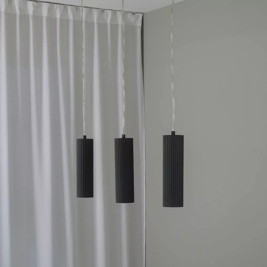 Costilla taklampa från Markslöjd. Takskena i vitt med räfflade skärmar. 1,5m transparent pvc kablar. Monteras med takbygel. 3xGU10, max 7W LED. Ljuskällor ingår ej.