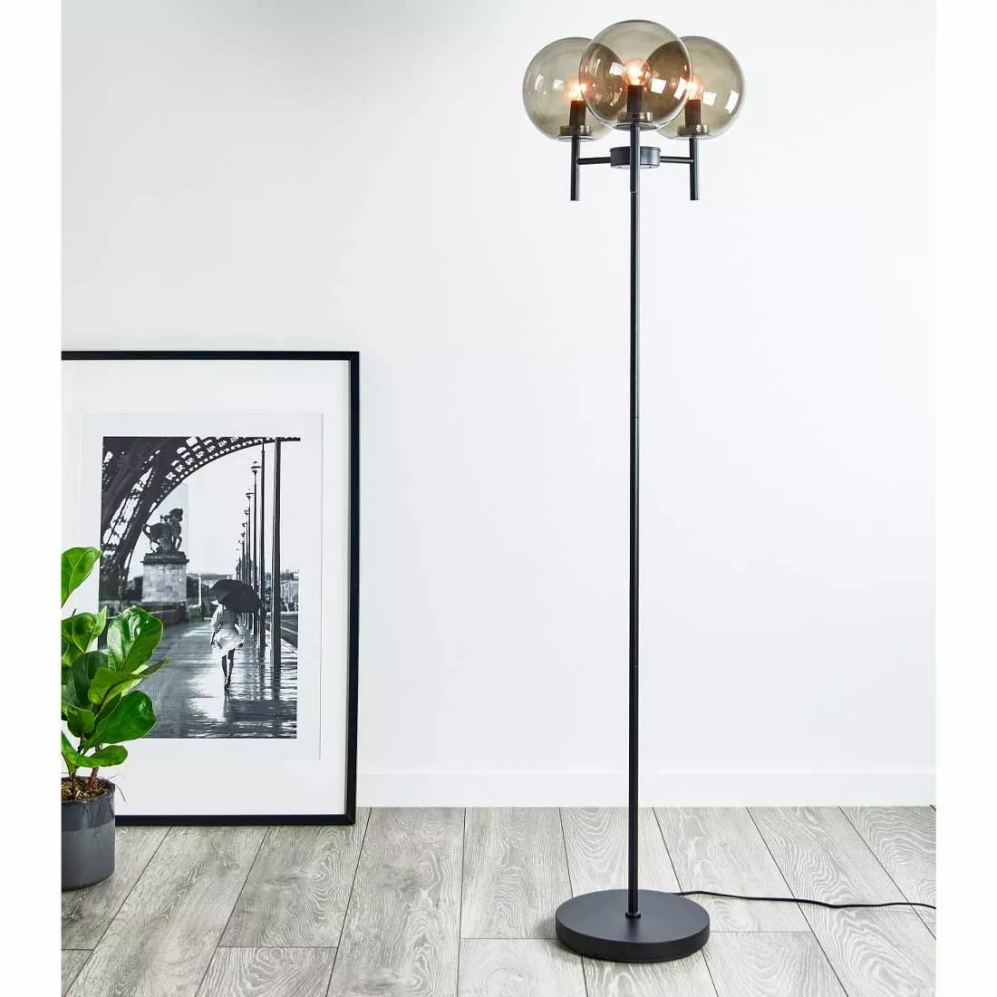 Golvlampan Crown är en vacker lampa med sina tre rökfärgade glasglober på toppen och den svarta basen. Crown har en dimmer som är inbyggd och klarar endast att dimra ljuskällor som är anpassade för detta. Placera golvlampan på en plats där du och alla andra kan njuta av den.