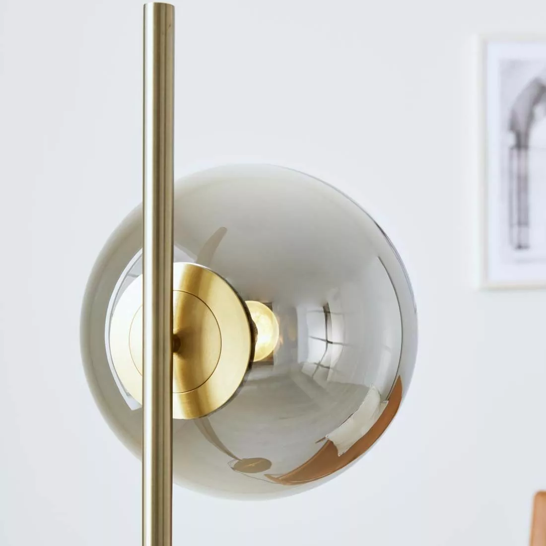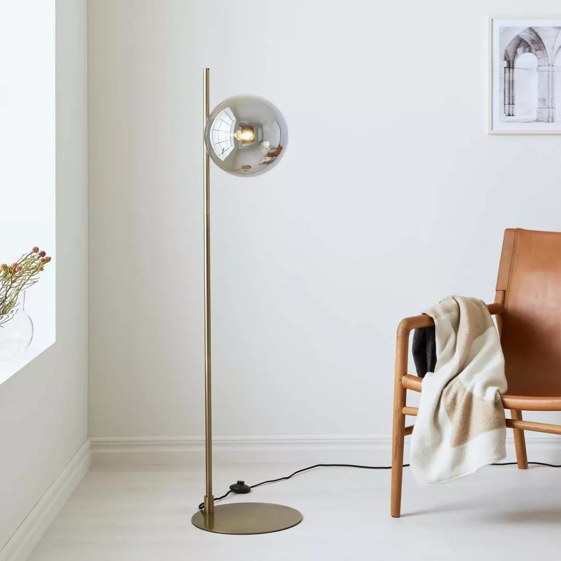 Dione är en modern golvlampa som också är en vacker inredningsdetalj. En riktig stämningsgivande detalj i hemmets vardagsrum med stomme i antikmässing och rökfärgad glaskupa över ljuskällan. Med en E14-ljuskälla med varmt sken omkring 2100K blir Dione en stämningsfull golvlampa med trendig design att lysa upp ett hörn eller en tavelvägg med. Golvlampan Dione från Markslöjd har 2m lång kabel med fotströmbrytare och väggkontakt.