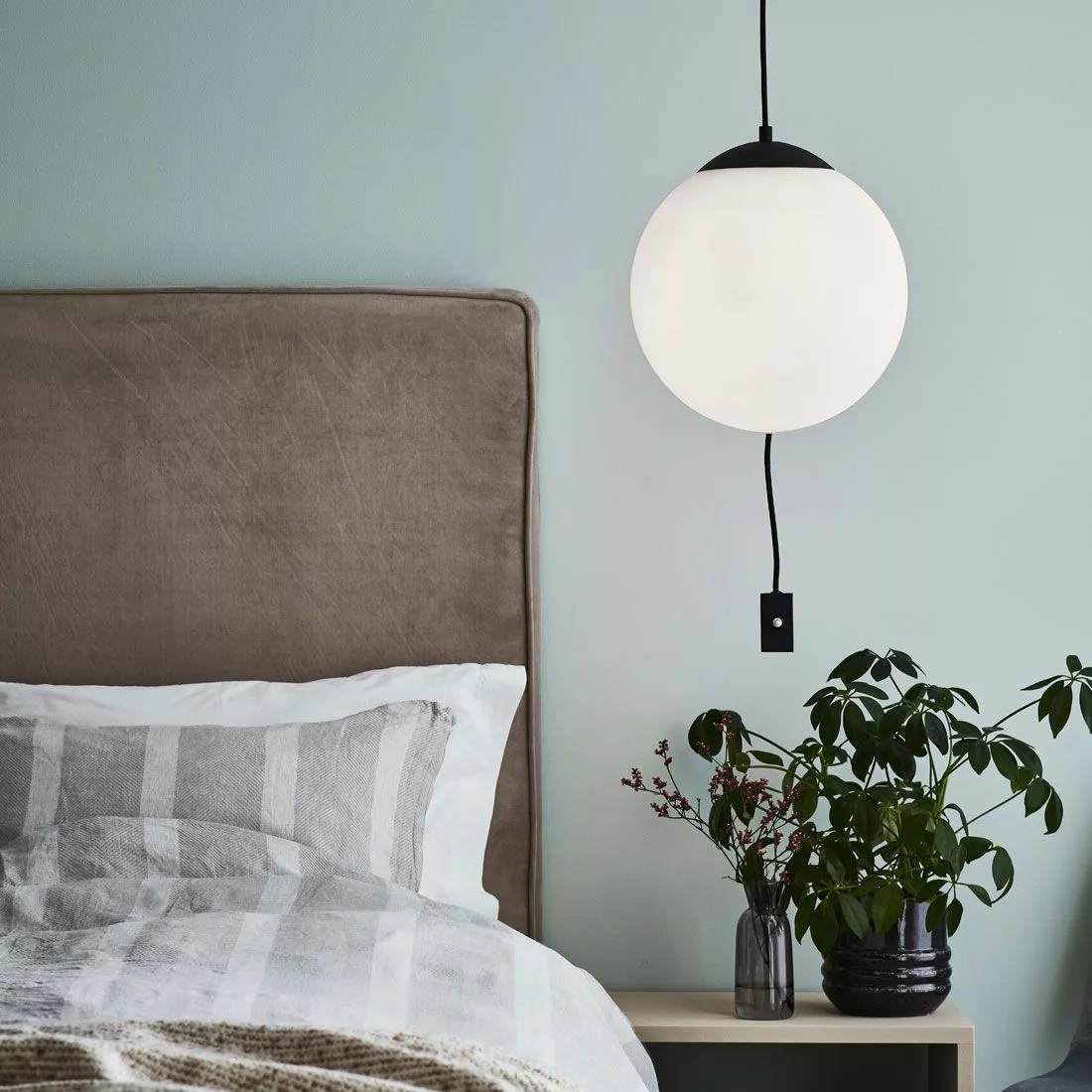 Here är en modern och sober taklampa från Markslöjd. Med lampans opalvita glaskula ger den ett stämningsfullt och fint ljus. Heres placering av strömbrytare som hänger nerför lampan gör den till den perfekta sänglampan. Here är både snygg, praktiskt och funktionell, vilken kombo!