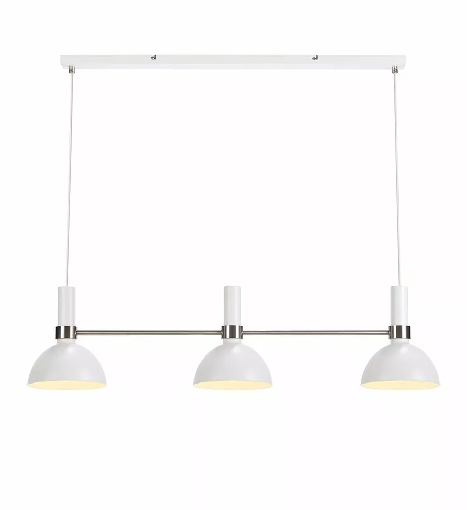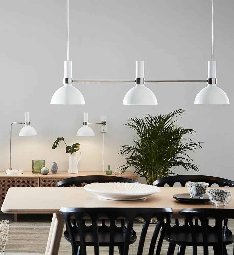 Serien Larry från Markslöjd är designad av inredningsdesignern Monica Mulder. Taklampan Larry i vitt har detaljer i krom och monteras på bygel i taket. Lampan gör sig lika bra över köksön som matbordet och ger ett riktat och bra ljus. Se våra rekommendationer på ljuskälla till Larry taklampa.