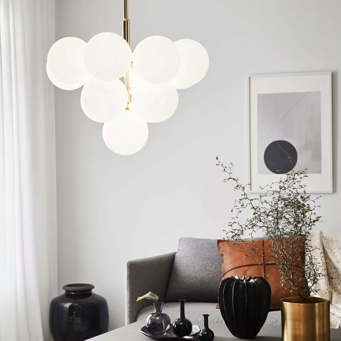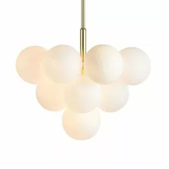 Merlot i mässing är en vacker och majestätisk taklampa. Som med sina 13 st opalvita glaskulor ger ett stämningsfullt ljus fullt av elegans. Dessa glaskulorna ihop med mässingen skapar verkligen ett mästerverk som passar perfekt över matsalsbordet eller i vardagsrummet. Ljuskällor ingår ej.