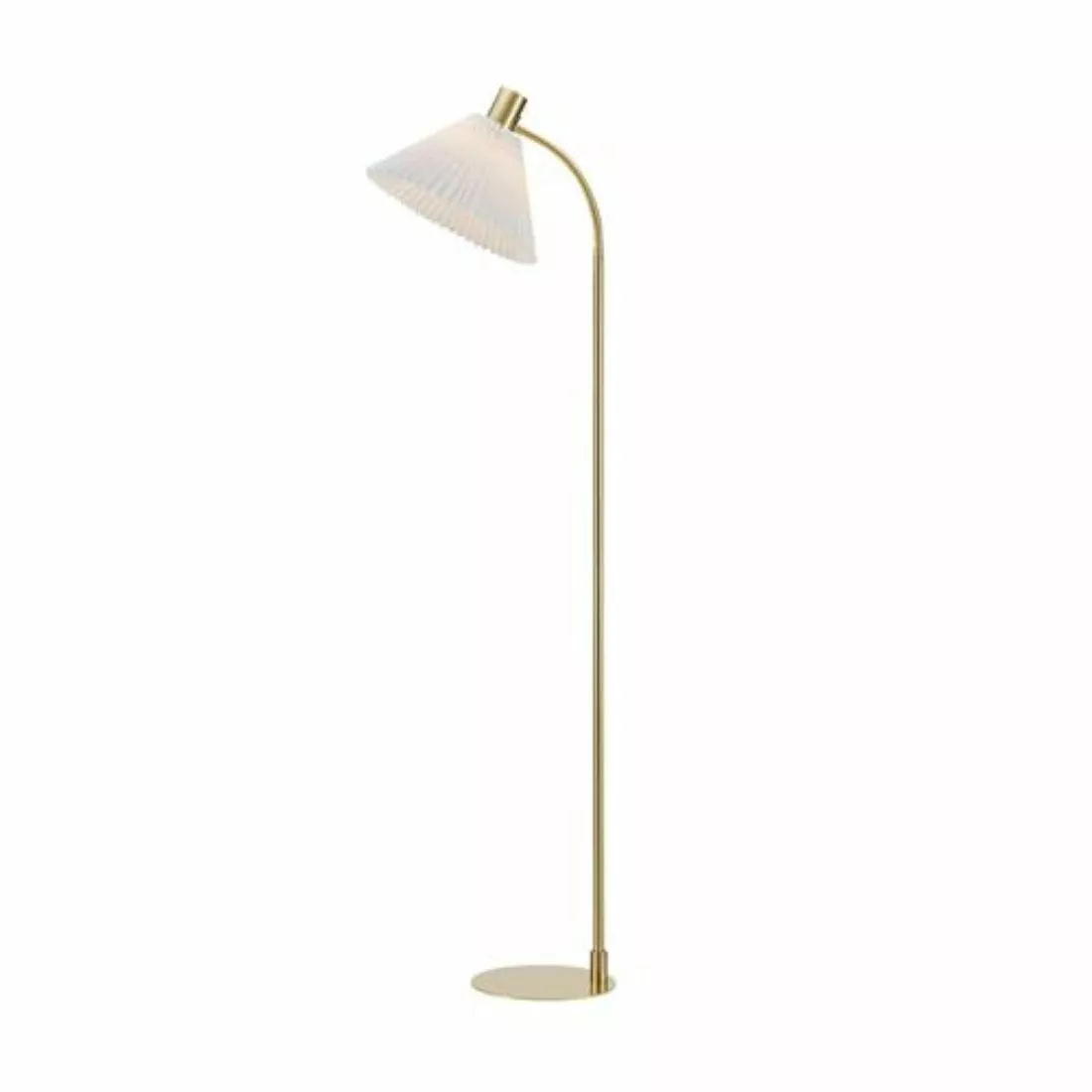 Mira golvlampa från Markslöjd. Bas i borstad mässning och skärm i vit plisserad textil. 2m transparent pvc kabel med brytare på sladden och väggkontakt. 1xE27, max 40W. Ljuskälla ingår ej.