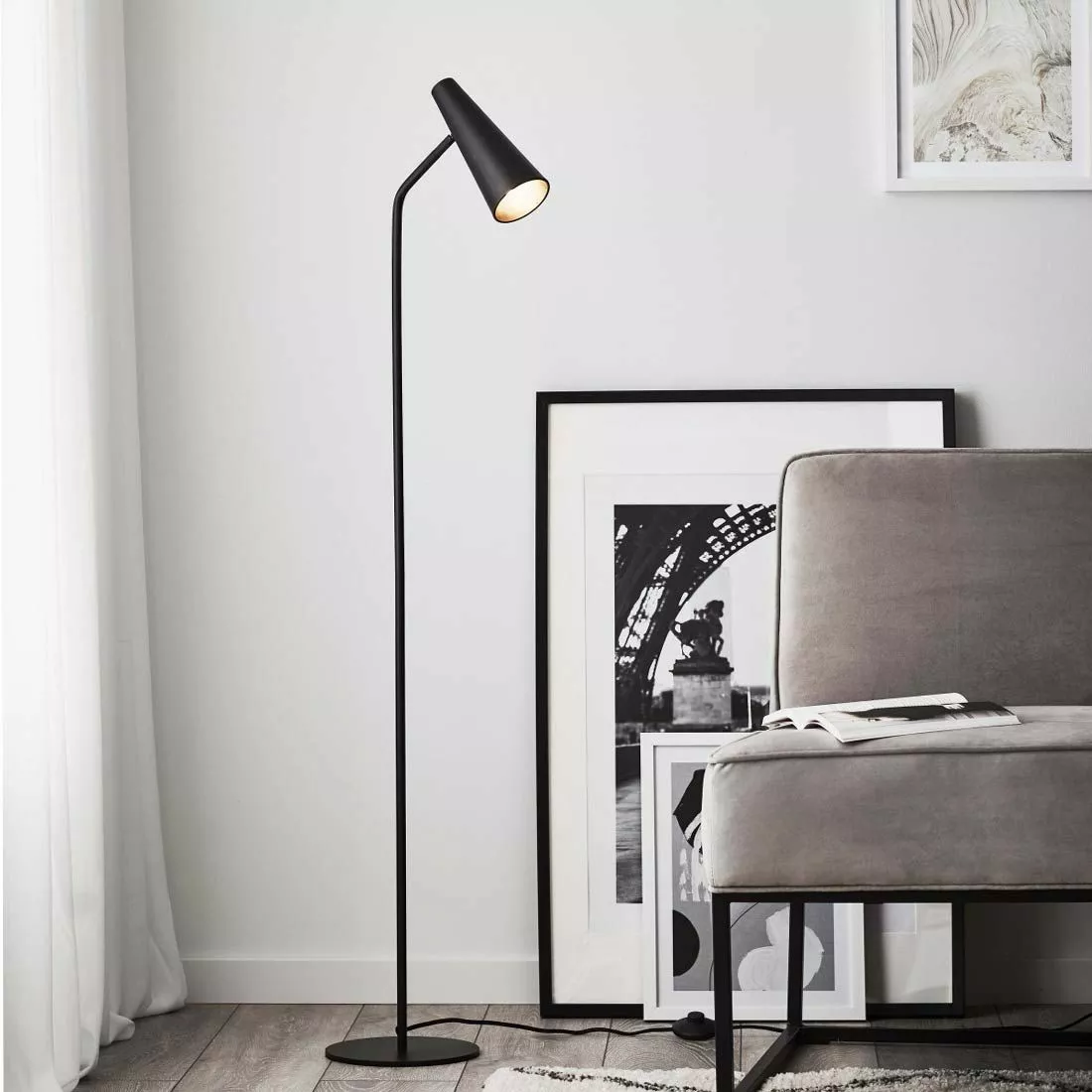 Golvlampan Peak från Markslöjd är en svart golvlampa i metall. Armaturens design är stilfull och enkel vilket gör den attraktiv i sin enkelhet. Placera lampan vid soffan, fåtöljen eller som sänglampa om du inte vill borra i väggen. Peak har en två meters textilkabel och brytaren sitter på kabeln.
