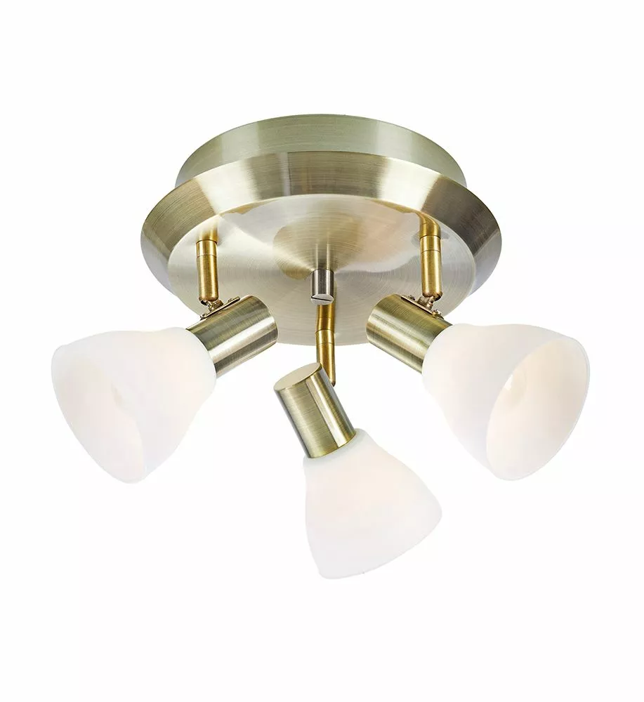 Takspotlight i antik mässing med tre stycken riktbara lamphuvuden i opalvitt glas. Taklampan Vero ger ett jämnt och bra ljus i ett rum. Vero har krokupphäng som möjliggör en lätt och smidig montering på takkrok. Komplettera med en passande ljuskälla utefter behov. Se Lampans rekommendationer under ”Köp till”.