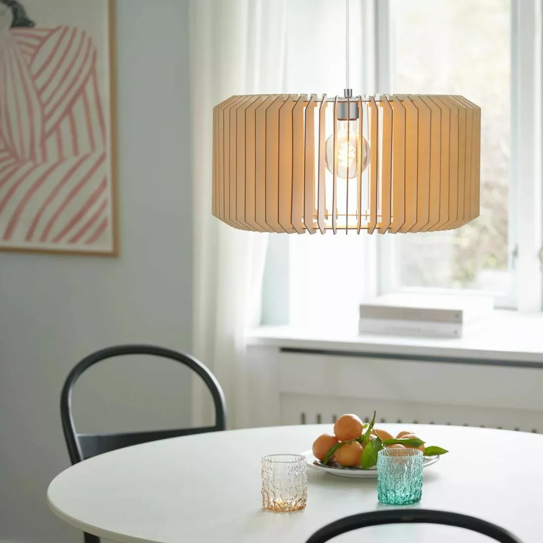 Asti är en öppen pendellampa där trästrukturen bjuder in naturen och skapar ett vackert samspel mellan ljus och skugga. Den luftiga designen låter ljuset spridas nedåt och in i rummet på det allra vackraste sätt. Kromsockeln och de många lamellerna skapar ett elegant men ändå lätt designuttryck. Lägg till en dekorativ glödlampa och skapa din egen look.