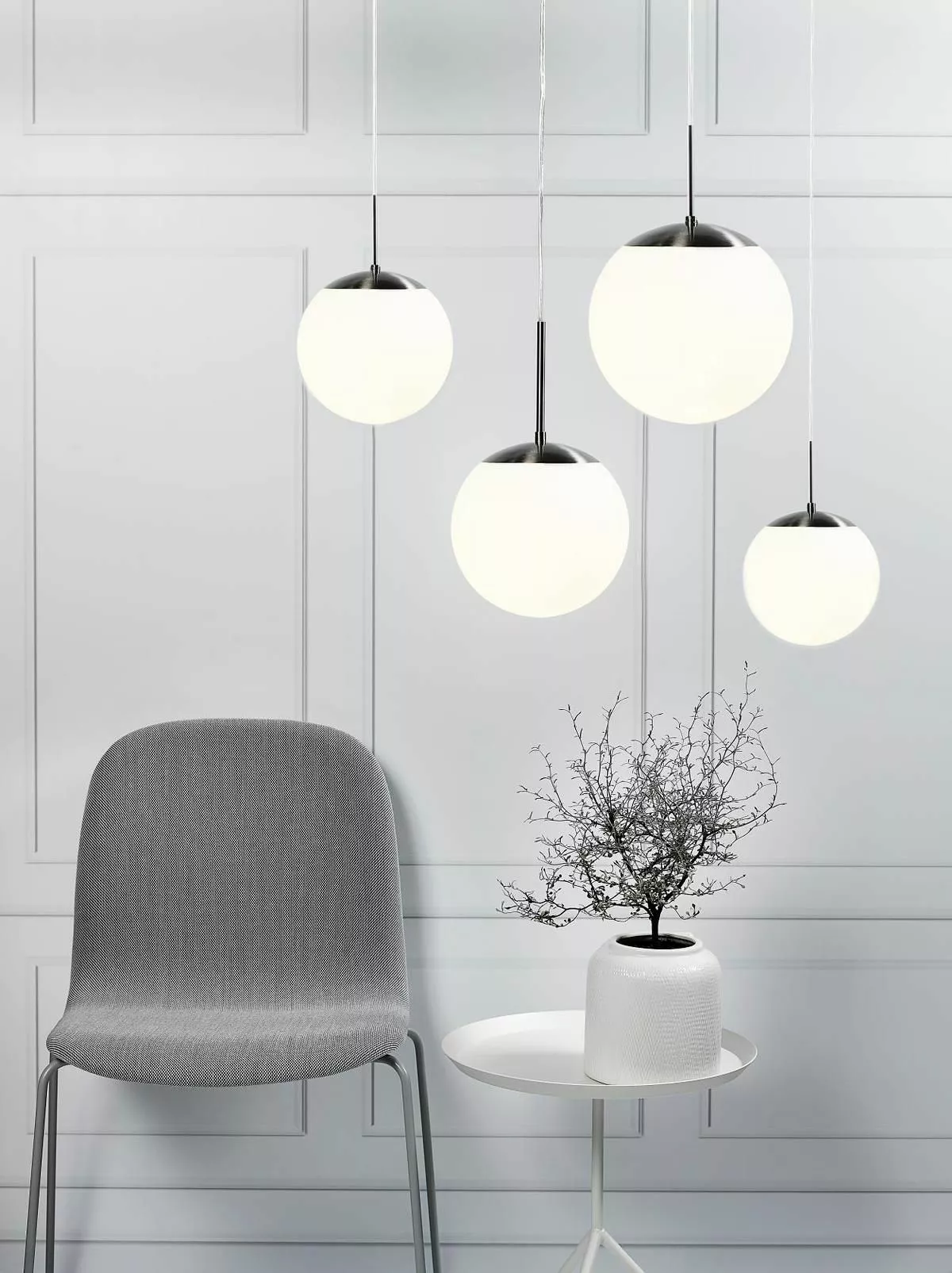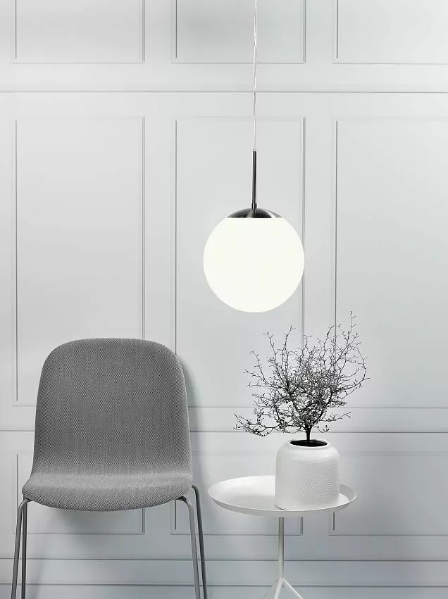 Klassisk globlampa att hänga i hall eller över köksbordet. Gör sig också väldigt bra i grupp i ett större utrymme eller på olika höjd för ett uppseendeväckande blickfång. Café har ett stilrent formspråk med en opalvit glasglob som ger ett mjukt och jämnt ljus. Café taklampa har en transparent kabel och detaljer i borstad stål.