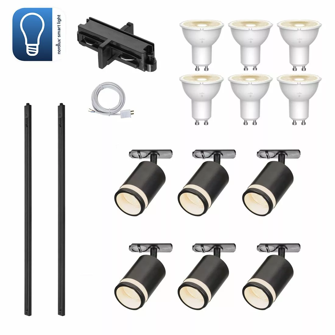 Komplett skensystem med 6 stycken spotlight av modelln Link Rondie från Nordlux. Det ingår 6 smarta ljuskällor där du kan ställa olika styrkor och kelvingrader för att ljusdesigna ditt hem.