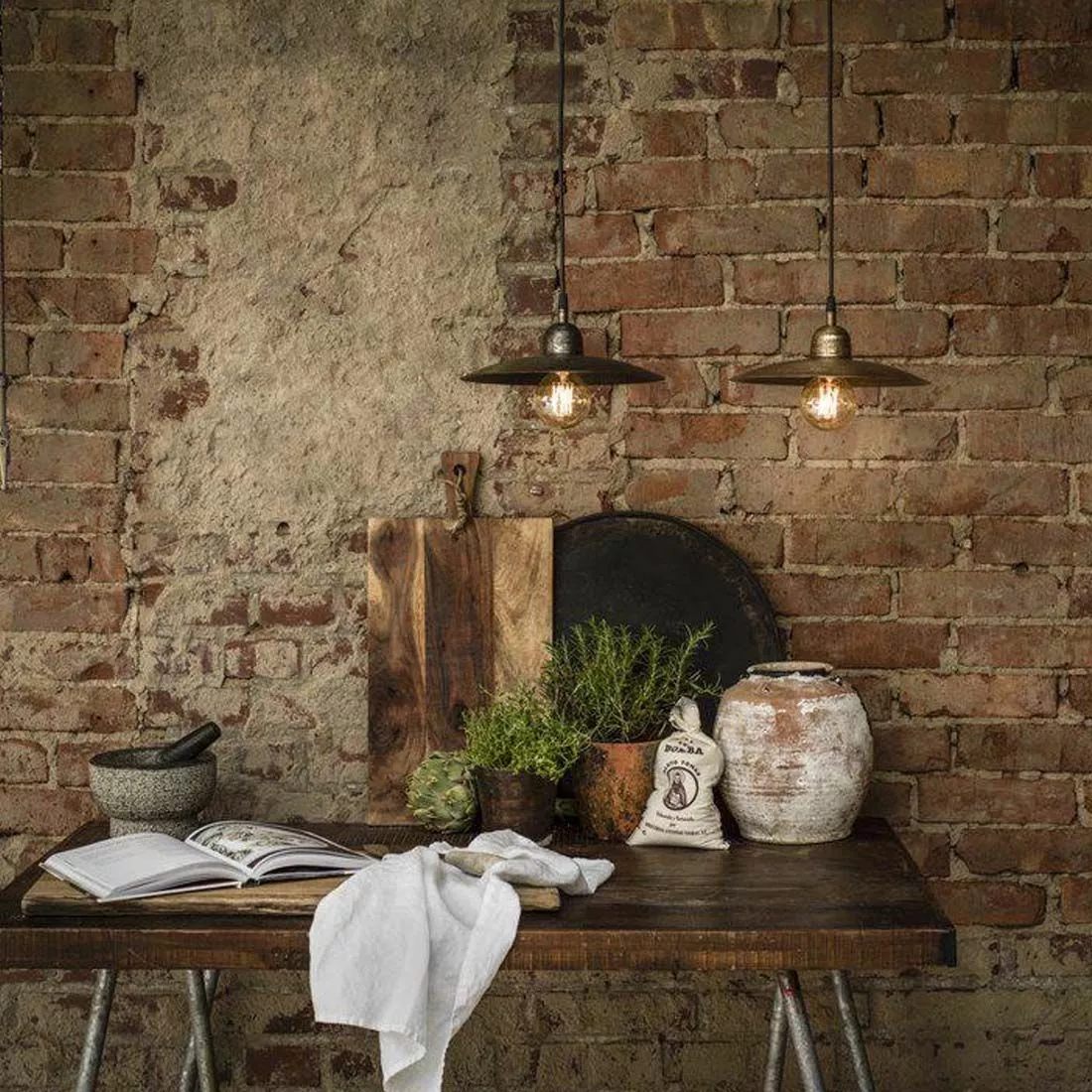 En skomakarlampa i industistil med skärm i bankad råmässing som ger ett rått intryck. Perfekt i par över köksbänken eller köksbordet.