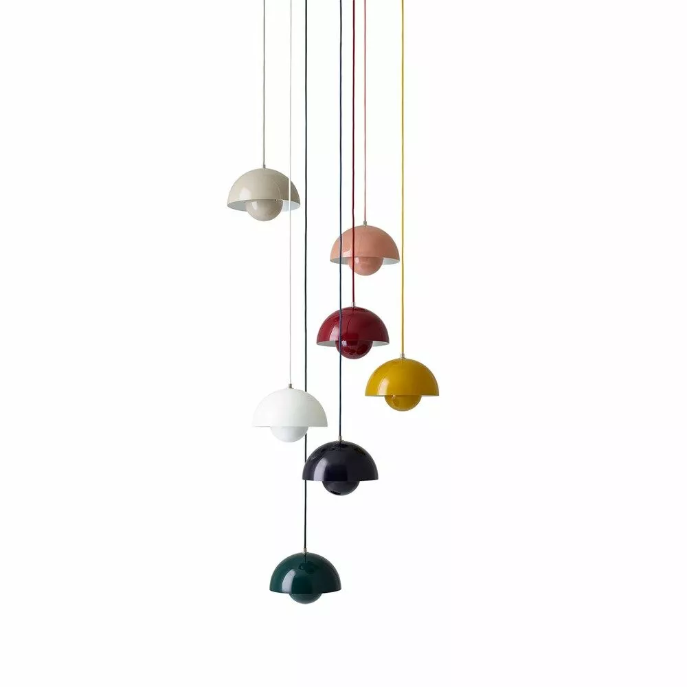 Taklampan och tillika designklassiskern Flowerpot i ljusgrå matt färg. Flowerpot formgavs redan 1969 av designikonen Verner Panton och är idag en given klassiker. Flowerpot fick sitt namn efter 60-talets flower-power rörelse och har ett lekfullt men samtidigt väl genomtänkt formspråk. Det bländskydd som reflekterar upp ljuset i skärmen och bidrar med ett mjukt och indirekt ljus, är samtidigt det som kännetecknar Flowerpot för dess nostalgiska karaktär och identitet.