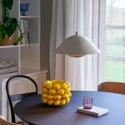 Klassiska taklampan P376 KF1 formgiven av Kastholm Fabricius, två danska arkitekter inom mordenismen på 60-talet. P376 formgavs år 1963 och är idag en modern klassiker med sin tidstypiska danska design. Taklampan har fem stycken formade skärmar som tillsammans ger ett bländfritt och mjukt ljus. Modellen är vit och har en vit textilkabel som är 4m lång. KF1 är lika vacker solitär som i par över ett längre matbord.